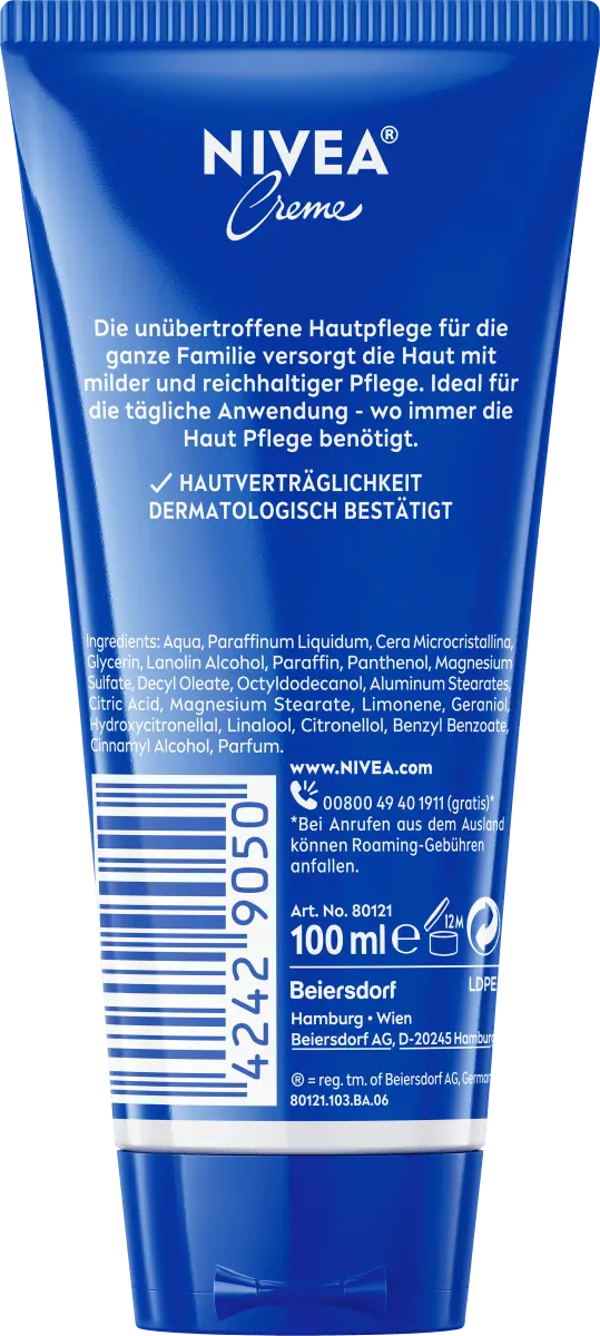 >Крем NIVEA в тюбике питает и защищает кожу благодаря своей богатой формуле. Крем подходит для всех типов кожи, а также удобен в дороге. Обладая особенно нежным и популярным ароматом, крем является незаменимым помощником для ежедневного ухода.
