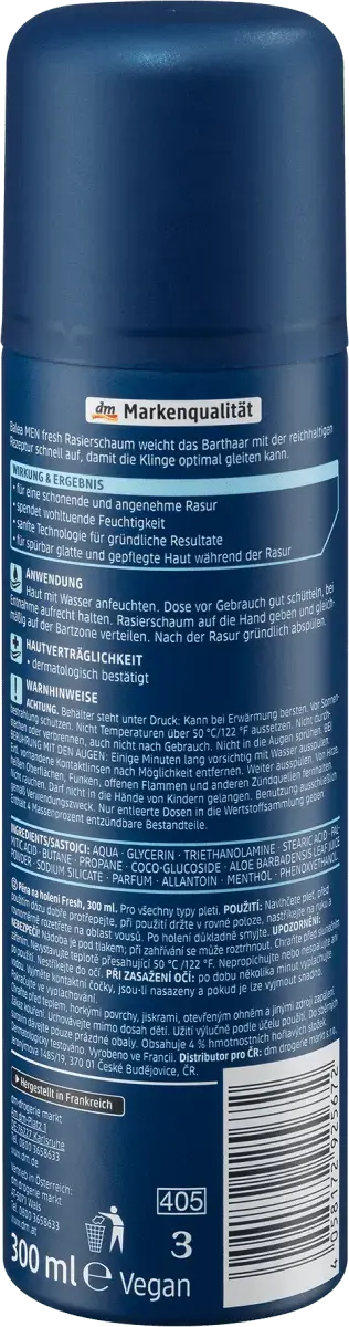 Свежая пена для бритья Balea MEN быстро смягчает волосы бороды благодаря богатой формуле, благодаря чему лезвие может оптимально скользить. для нежного и приятного бритья. Он обеспечивает успокаивающее увлажнение, а бережная технология обеспечивает превосходные результаты и заметно гладкую и напитанную кожу во время бритья. Рецепт без микропластика и водорастворимых синтетических полимеров.