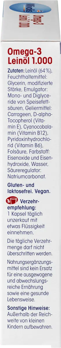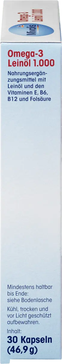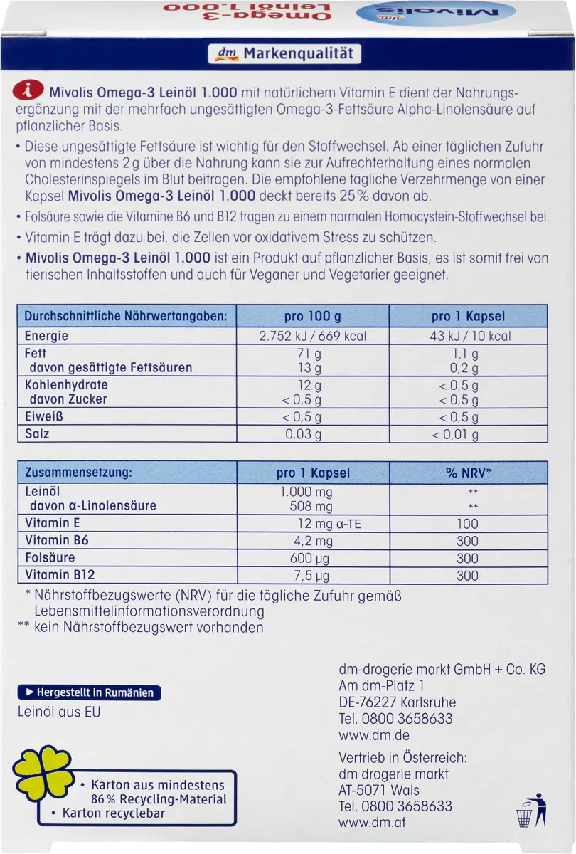 Льняное масло Mivolis Omega-3 1000 с натуральным витамином Е используется в качестве пищевой добавки с полиненасыщенной жирной кислотой омега-3 растительного происхождения альфа-линоленовой кислотой. Эта ненасыщенная жирная кислота важна для обмена веществ. При ежедневном приеме не менее 2 г с пищей он может помочь поддерживать нормальный уровень холестерина в крови. Рекомендуемое ежедневное употребление одной капсулы льняного масла Миволис Омега-3 1000 уже покрывает 25% этой суммы. Фолиевая кислота и витамины В6 и В12 способствуют нормальному метаболизму гомоцистеина. Витамин Е помогает защитить клетки от окислительного стресса. Льняное масло Mivolis Омега-3 1000 — продукт растительного происхождения, а значит, не содержит ингредиентов животного происхождения, а также подходит веганам и вегетарианцам.
