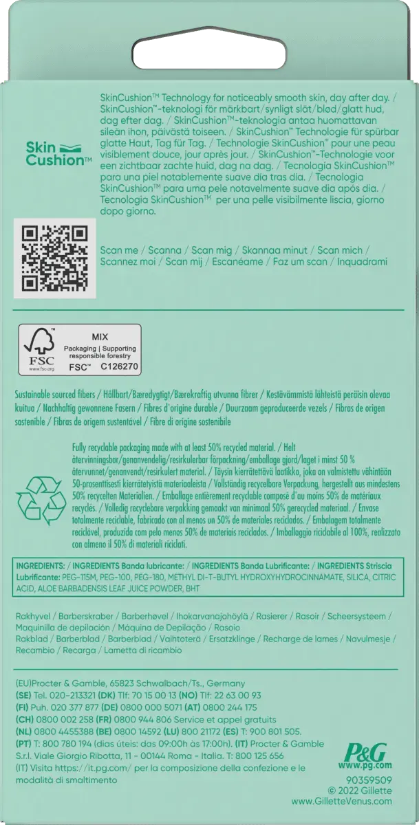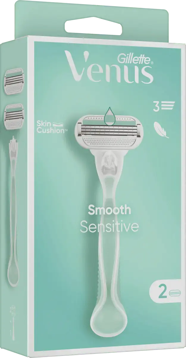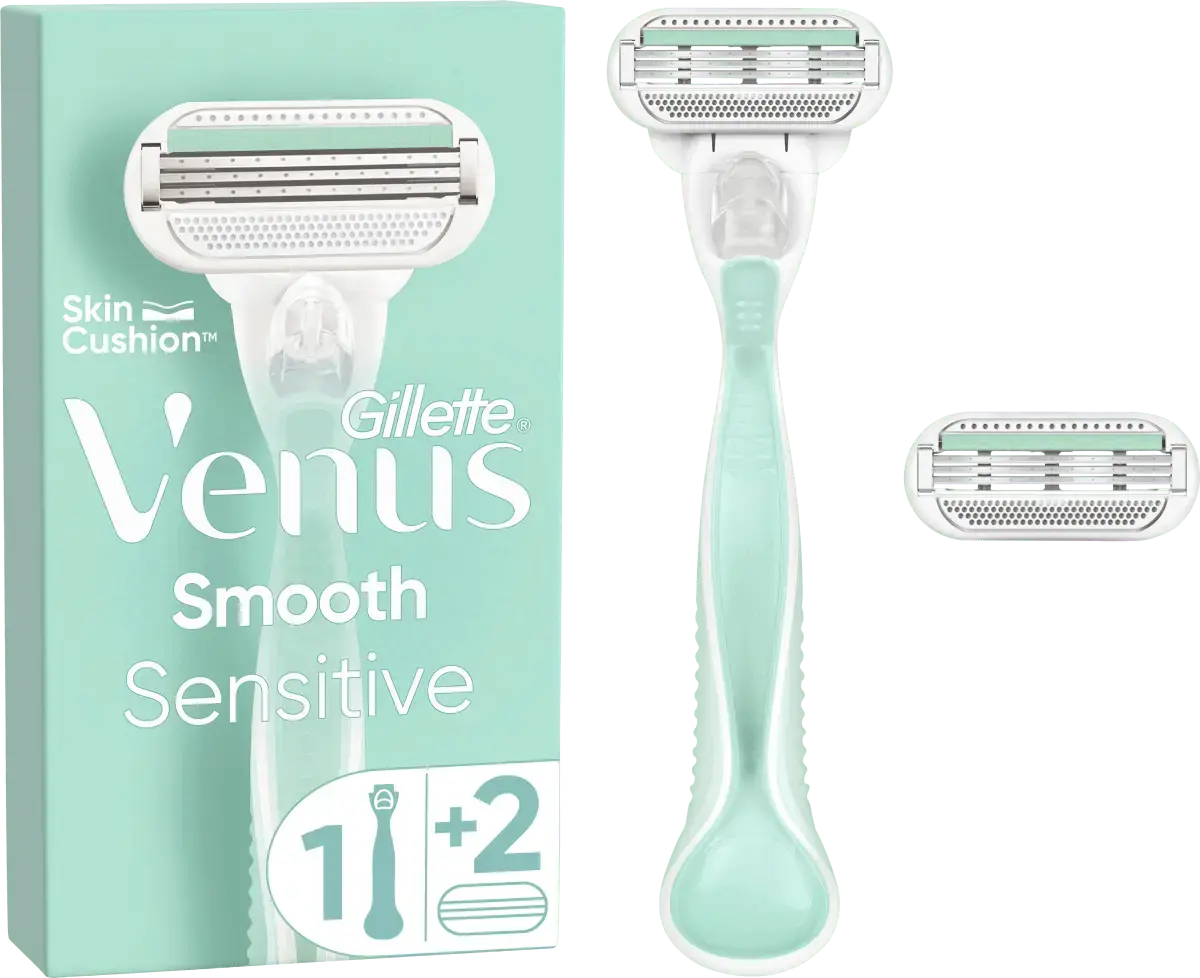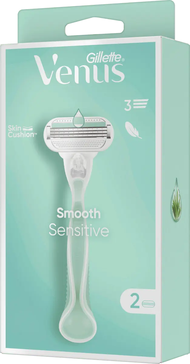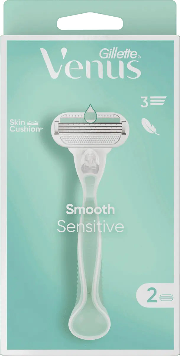 br>Бритва Gillette Venus Smooth Sensitive разработана специально для женского тела и идеально подходит для защиты чувствительной кожи. Бритва имеет удобный захват благодаря мягкой ручке, которая на 30% изготовлена ​​из переработанного пластика. 3 высококачественных лезвия обеспечивают нежное и чистое бритье без особых усилий даже чувствительной кожи. Технология Venus SkinCushionTM помогает защитить кожу от раздражений, вызванных бритьем, каждый раз при бритье.