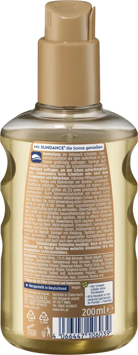 Веганское солнцезащитное масло SUNDANCE Спрей SPF 20 является водонепроницаемым* (*Независимый испытательный институт подтверждает: после 40 минут пребывания в воде сохраняется не менее 50 % заявленного солнцезащитного фактора) и соответствует Закону о гавайских рифах** (**Без УФ-фильтров октиноксата и оксибензон). Рецепт без микропластика и водорастворимых, чисто синтетических полимеров. *Упаковка содержит не менее 70 % переработанного материала.