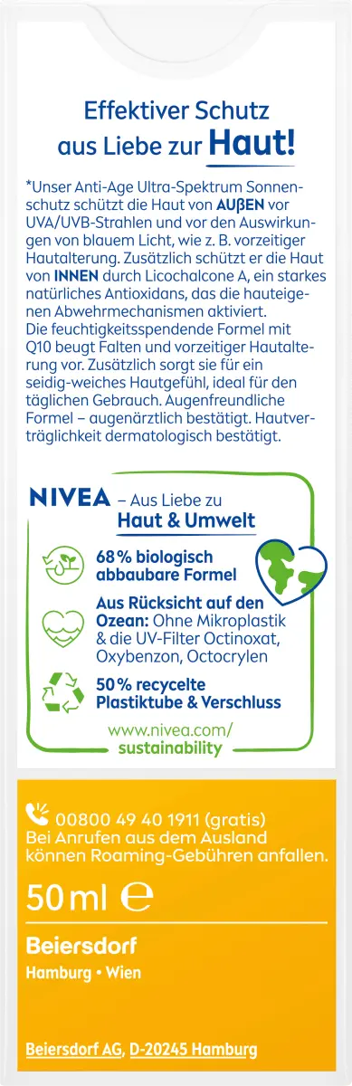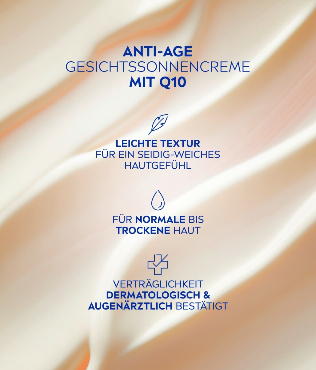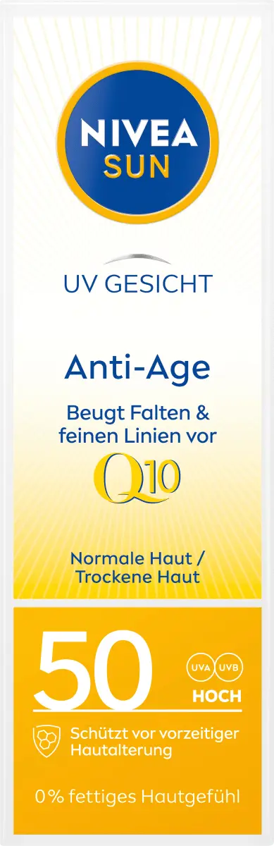 NIVEA SUN Face Anti Age SPF50 обеспечивает мгновенную и эффективную защиту от солнечных лучей A/UVB от солнечных ожогов и преждевременного старения кожи. Приятная формула обеспечивает интенсивное увлажнение и нежирна — идеальна для ежедневного использования.