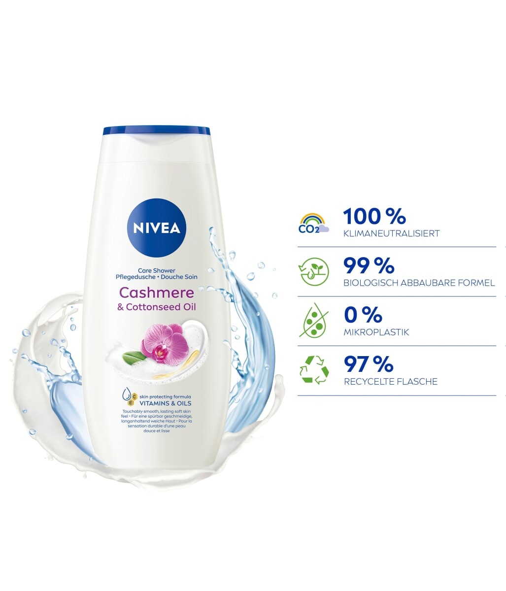 Ощутите ощущение эластичности кожи с помощью NIVEA Care & Cashmere care душ. Почувствуйте, как насыщенный крем-душ с маслом семян хлопка, витаминами С и Е и другими ценными маслами нежно заботится о вашей коже. Наслаждайтесь бархатистой мягкой пеной и чувственным ароматом цветущей орхидеи. Формула на 99% биоразлагаема и не содержит микропластика и водорастворимых, чисто синтетических полимеров. Бутылка также на 97 % изготовлена ​​из переработанного материала, без крышки и этикетки.