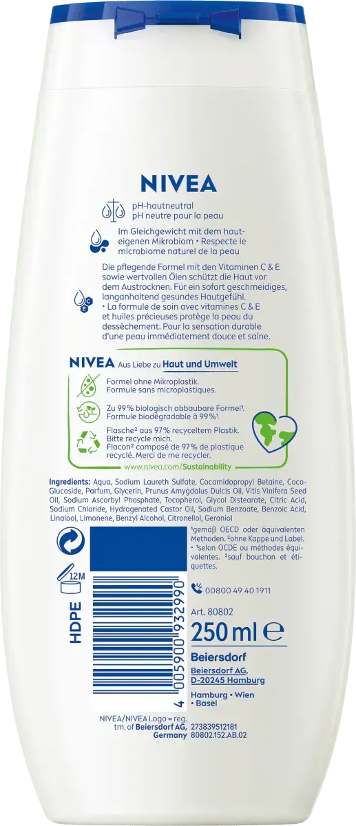 Откройте для себя ощущение эластичности кожи с помощью душа NIVEA Creme Soft care. Почувствуйте, как шелковистый гель для душа нежно заботится о вашей коже во время душа благодаря своей формуле с натуральным миндальным маслом, другими маслами и витаминами С и Е. Наслаждайтесь бархатисто-мягкой кремовой пеной и нежным ароматом. Формула на 99% биоразлагаема и не содержит микропластика и водорастворимых, чисто синтетических полимеров. Бутылка также на 97 % изготовлена ​​из переработанного материала, без крышки и этикетки.