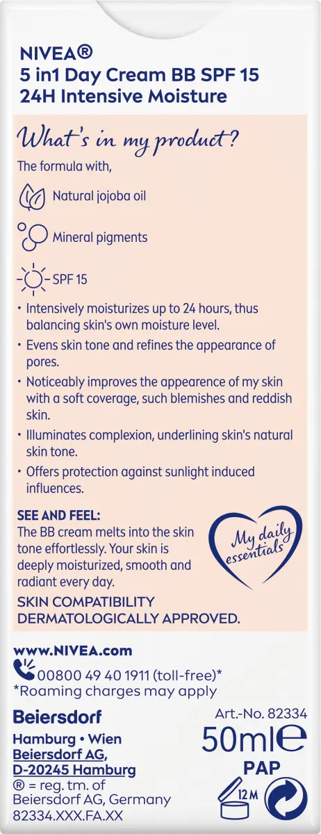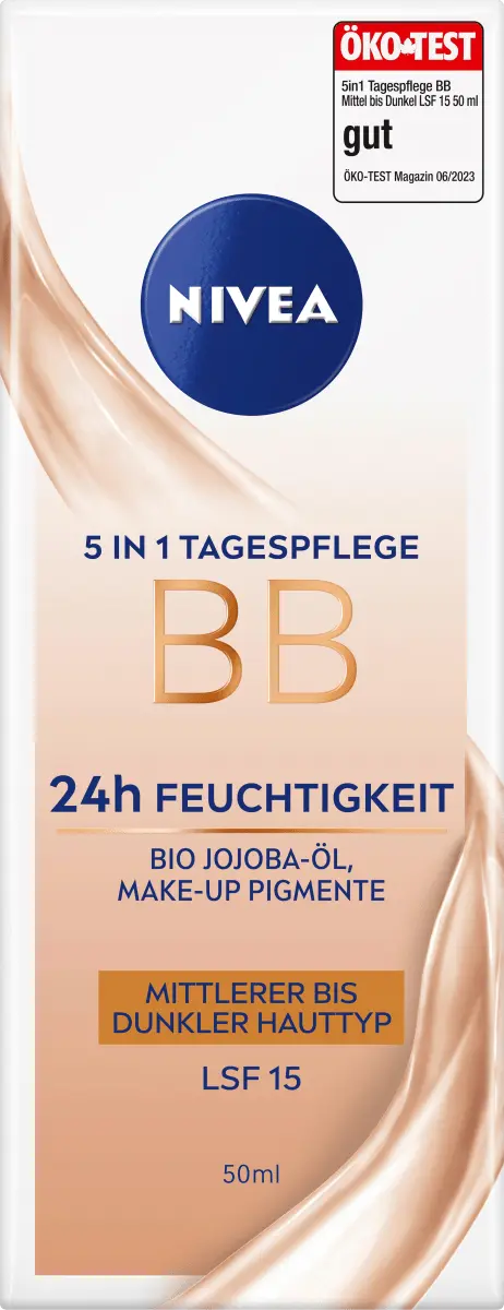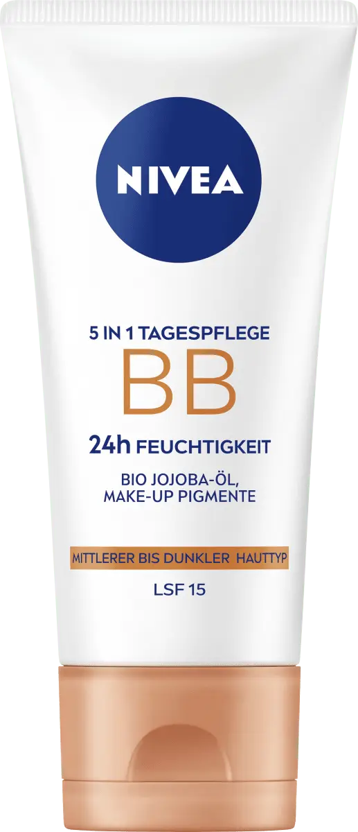 Дневной уход NIVEA Essentials 5in1 BB с 24-часовым увлажнением для средней и темной кожи с SPF 15 снабжает кожу органическим маслом жожоба и косметическими пигментами. Он выравнивает цвет лица и улучшает внешний вид пор. Он также покрывает небольшие недостатки красоты, такие как признаки усталости, красноватые участки и мелкие морщинки, совершенствуя кожу и придавая ей естественно сияющий цвет лица. Обеспечивает вашу кожу легкой, быстро впитывающейся влагой и предотвращает преждевременное старение кожи под воздействием света благодаря SPF 15. Для естественного сияющего цвета лица.