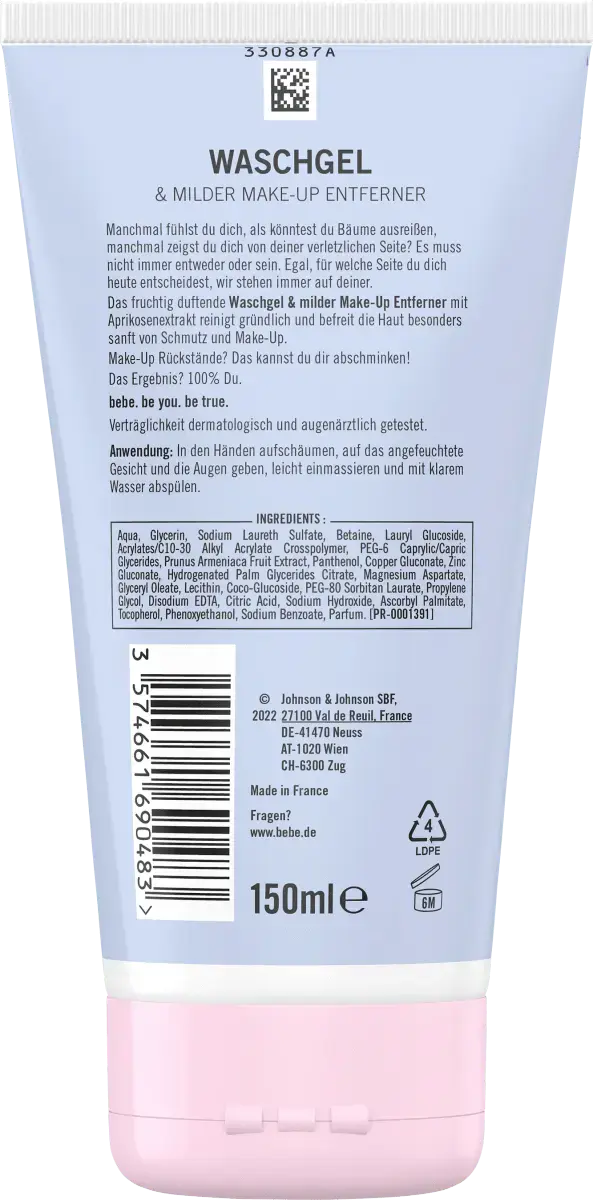 Гель для умывания и мягкое средство для снятия макияжа с глаз Bebe очищает тщательно и излучает особенно фруктовый аромат. Очищение лица с экстрактом абрикоса особенно бережно удаляет загрязнения и макияж с кожи. Кроме того, очищающее средство для лица прошло дерматологические и офтальмологические испытания на совместимость с нормальной и комбинированной кожей.
