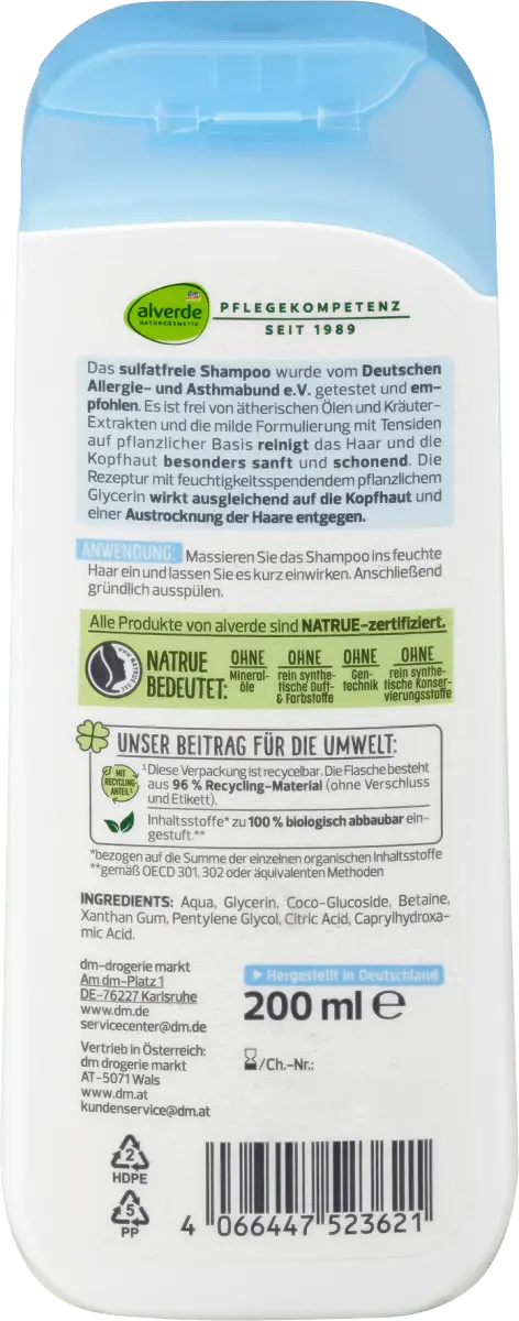 Шампунь Ultra Sensitiv от alverde NATURKOSMETIK протестирован и рекомендован Немецкой ассоциацией по борьбе с аллергией и астмой. Он не содержит эфирных масел и экстрактов трав, а мягкий состав с поверхностно-активными веществами растительного происхождения очищает волосы и кожу головы особенно нежно и бережно. Формула с увлажняющим растительным глицерином балансирует кожу головы и предотвращает высыхание волос. Рецепт без микропластика и водорастворимых, чисто синтетических полимеров.