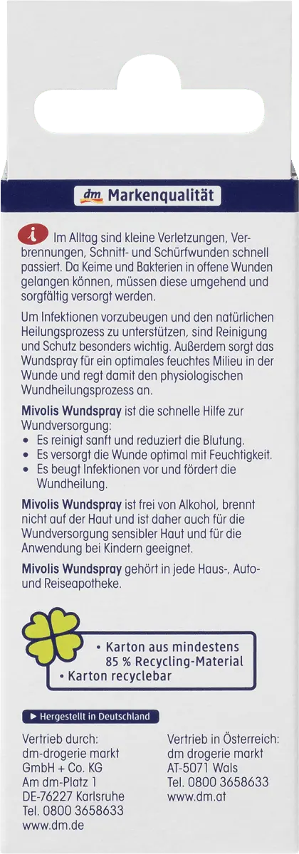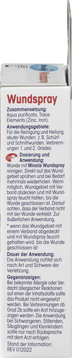 br>В повседневной жизни небольшие травмы, ожоги, порезы и ссадины могут произойти быстро. Поскольку в открытые раны могут попасть микробы и бактерии, лечить их необходимо немедленно и осторожно. Для предотвращения инфекций и поддержки естественного процесса заживления особенно важны очистка и защита. Спрей для ран также обеспечивает оптимальную влажную среду в ране и, таким образом, стимулирует физиологический процесс заживления ран. Спрей для ран Миволис – это быстрая помощь при уходе за ранами: - Мягко очищает и уменьшает кровотечение. - Обеспечивает рану оптимальной влажностью. - Предотвращает инфекции и способствует заживлению ран. Спрей для ран Миволис не содержит спирта, не обжигает кожу и поэтому также подходит для ухода за ранами на чувствительной коже и для использования у детей. Спрей для ран Миволис должен быть в каждом доме, автомобиле и дорожной аптечке. *если область раны накрыта повязкой и смачивается спреем для ран до закрытия раны.