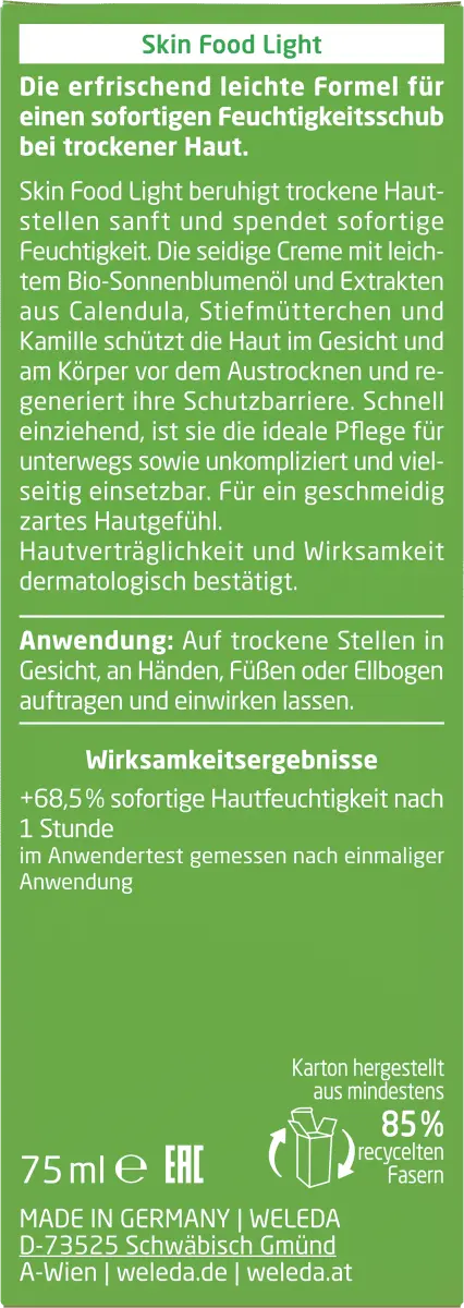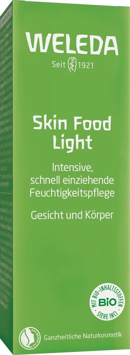 Weleda Skin Food Light — новый суперпродукт для сухой кожи . Мгновенно увлажняет и успокаивает сухую кожу. Шелковистый крем с легким органическим подсолнечным маслом и экстрактами календулы, анютины глазки и розмарина защищает кожу от пересыхания. Быстро впитывается, он станет идеальным спутником в вашей сумочке для увлажнения в дороге.