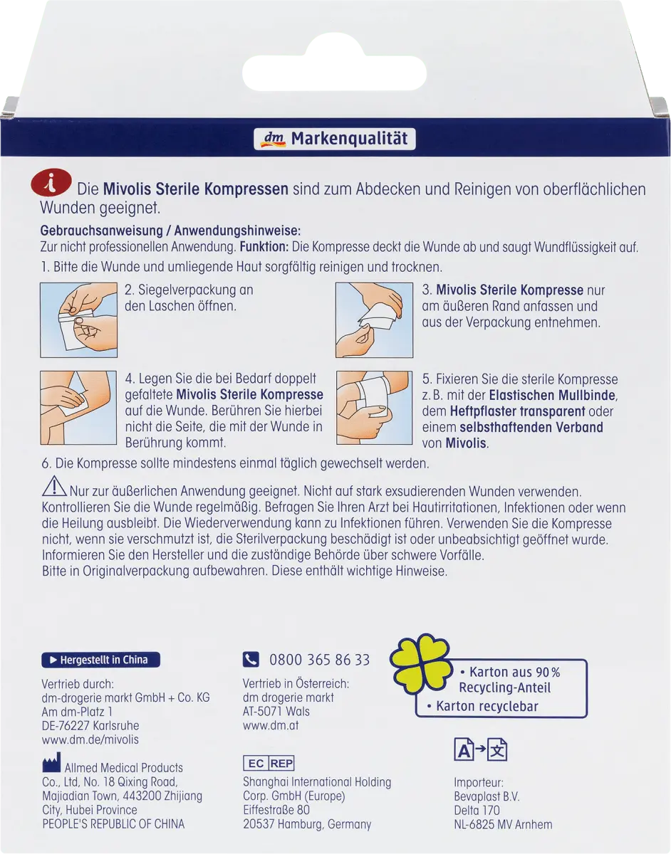 Инструкция по применению/инструкция по применению: Для непрофессионального использования. Функция: Компресс покрывает рану и впитывает раневую жидкость. 1. Тщательно очистите и высушите рану и окружающую кожу. 2. Откройте запечатанную упаковку по выступам. 3. Прикасайтесь только к внешнему краю стерильного компресса Миволис и извлекайте его из упаковки. 4. При необходимости наложите на рану сложенную вдвое стерильную повязку Mivolis. Не прикасайтесь к той стороне, которая соприкасается с раной. 5. Зафиксируйте стерильный компресс, например, эластичным фиксирующим бинтом, прозрачным лейкопластырем или самоклеющейся повязкой фирмы «Миволис». 6. Компресс следует менять как минимум ежедневно.