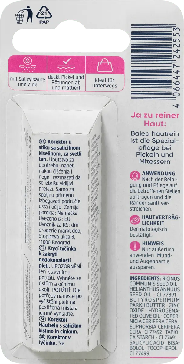 Консилер Balea Hautrein цвета 20 маскирует дефекты кожи , прыщи и черные точки исчезли. Практичная ручка содержит салициловую кислоту и поэтому идеально подходит для загрязненной кожи. Рецепт без микропластика и водорастворимых, чисто синтетических полимеров.