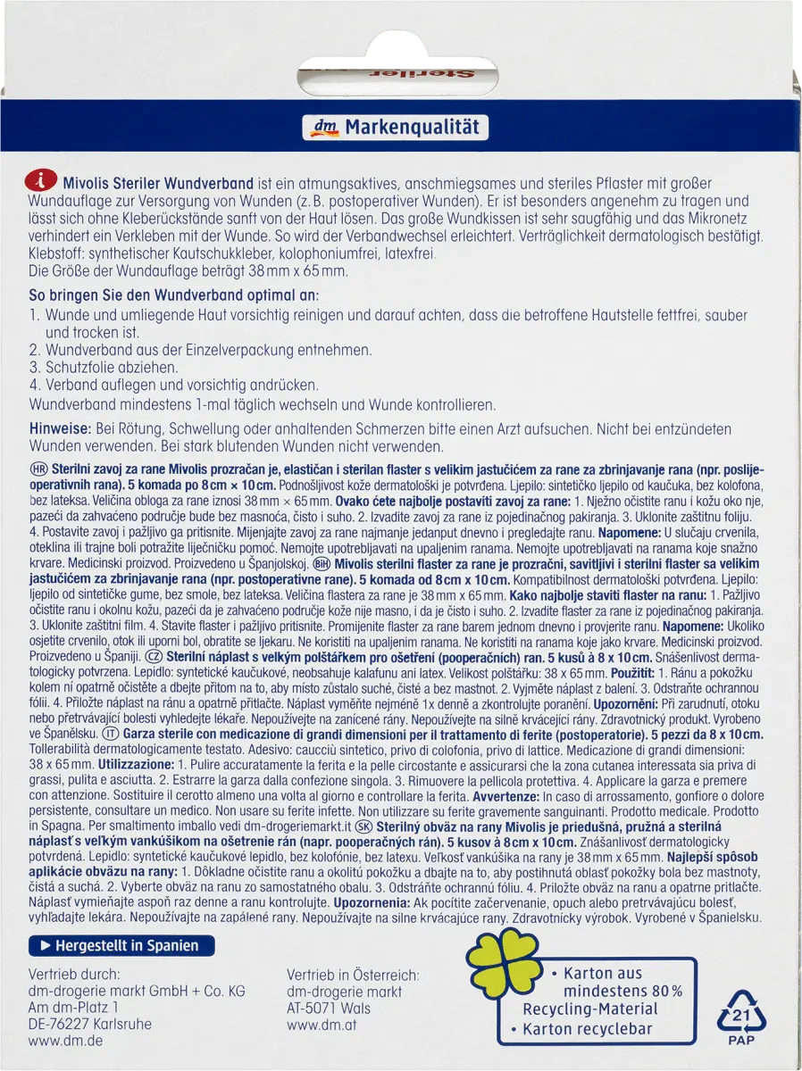 Стерильная раневая повязка Mivolis представляет собой дышащую, эластичную и стерильный пластырь с большой повязкой для ухода за ранами (например, послеоперационными). Его особенно удобно носить, и его можно аккуратно удалить с кожи, не оставляя следов клея. Большая подушечка для ран очень хорошо впитывает влагу, а микросетка предотвращает ее прилипание к ране. Это облегчает смену повязки. Клей: клей из синтетического каучука, без канифоли, без латекса. Совместимость подтверждена дерматологически. Размер раневой повязки: 38 х 65 мм.