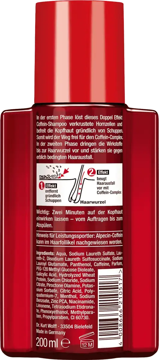 Шампунь Alpecin Double Effect ослабляет ороговевшие клетки и тщательно удаляет перхоть с кожи головы. Комплекс кофеина проникает в корень волоса и укрепляет его против наследственного выпадения волос. Шампунь должен оставаться на коже головы в течение двух минут. Веган.