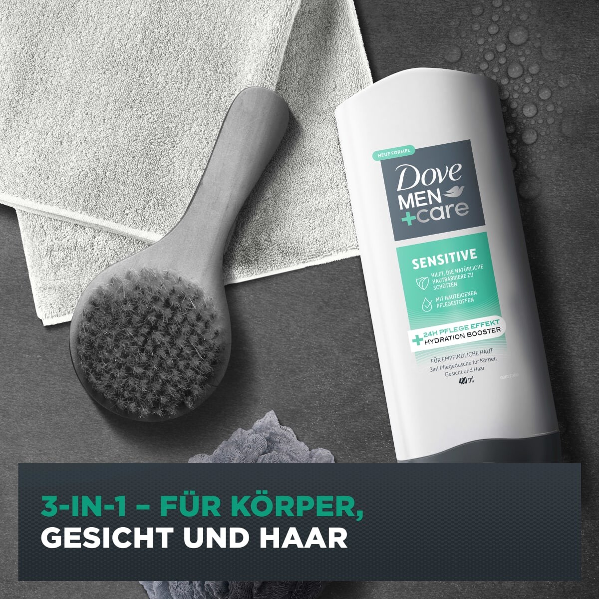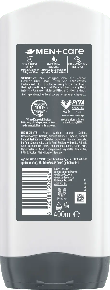 The Dove Men+ Care 3in1 Care Shower Sensitive подходит для тела, лица и волос. Мягкая, высокоэффективная формула с собственными ингредиентами для ухода за кожей особенно подходит для чувствительной и сухой кожи. Благодаря инновационной технологии Hydration Boost кожа интенсивно увлажняется и защищается от пересыхания. Помимо освежающего очищения, свежий аромат также делает кожу приятной.