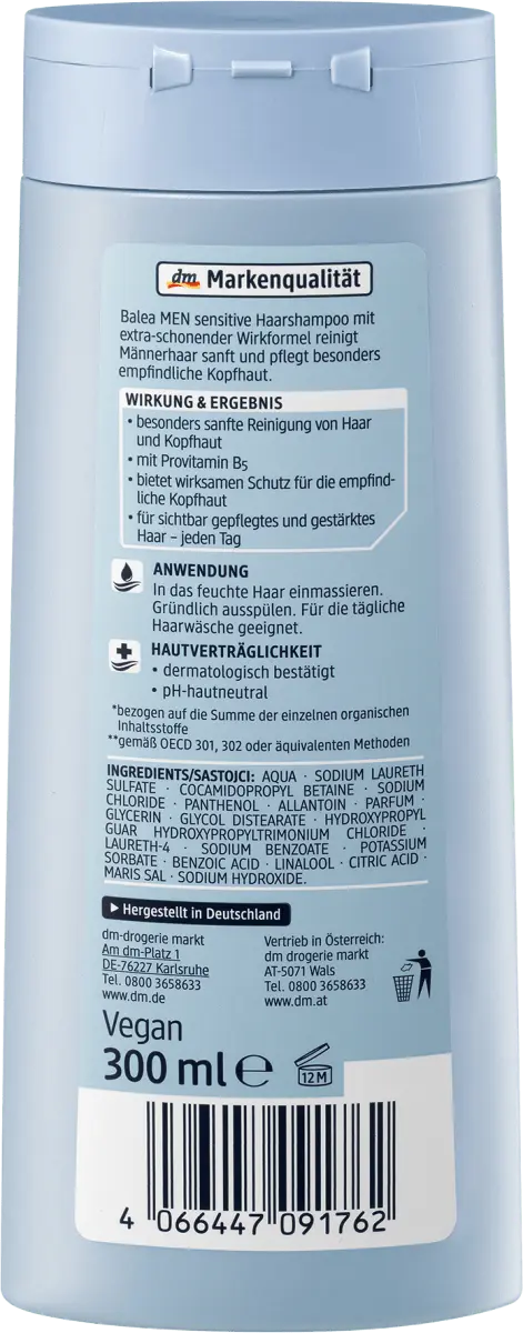 Шампунь Balea MEN Sensitive с особо нежной активной формулой бережно очищает волосы и ухаживает за особо чувствительной кожей головы. Формула с провитамином B5 обеспечивает эффективную защиту чувствительной кожи головы. Для заметного питания и укрепления волос. Рецепт без микропластика и водорастворимых, чисто синтетических полимеров. *на основе суммы отдельных органических ингредиентов. **согласно OECD 301, 302 или эквивалентным методам.