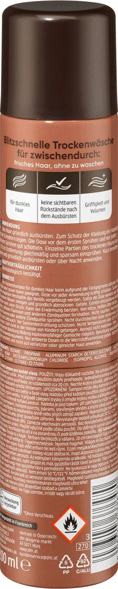 Сухой шампунь Balea Braun для темных волос – это молниеносное сухое мытье для между. За считанные секунды волосы снова становятся свежими, приобретают новую хватку и объемную пышность. Для свежего и ухоженного образа. Также идеально подходит для ночного использования. Состав без микропластика и водорастворимых, чисто синтетических полимеров.