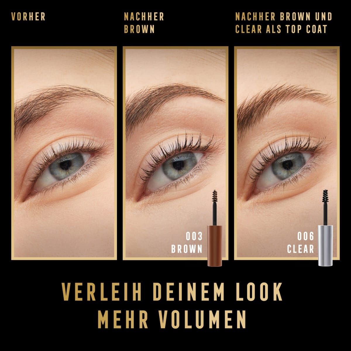 "Шаг 1: Поместите кисть-аппликатор на внутреннюю часть бровей и придайте волоскам форму с помощью геля для бровей Max Factor 2000 Calorie Brow Sculpt. Шаг 2: Следуя естественному направлению роста бровей, зачешите их вверх и наружу до середины и от середины вперед легкими движениями вниз».