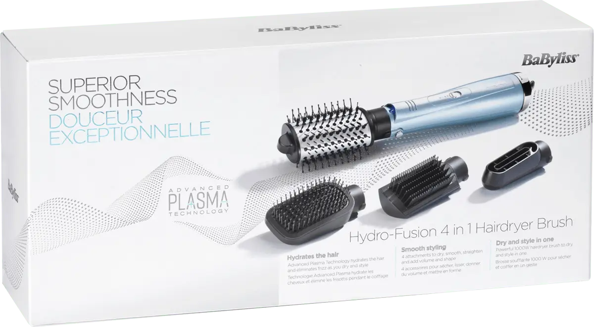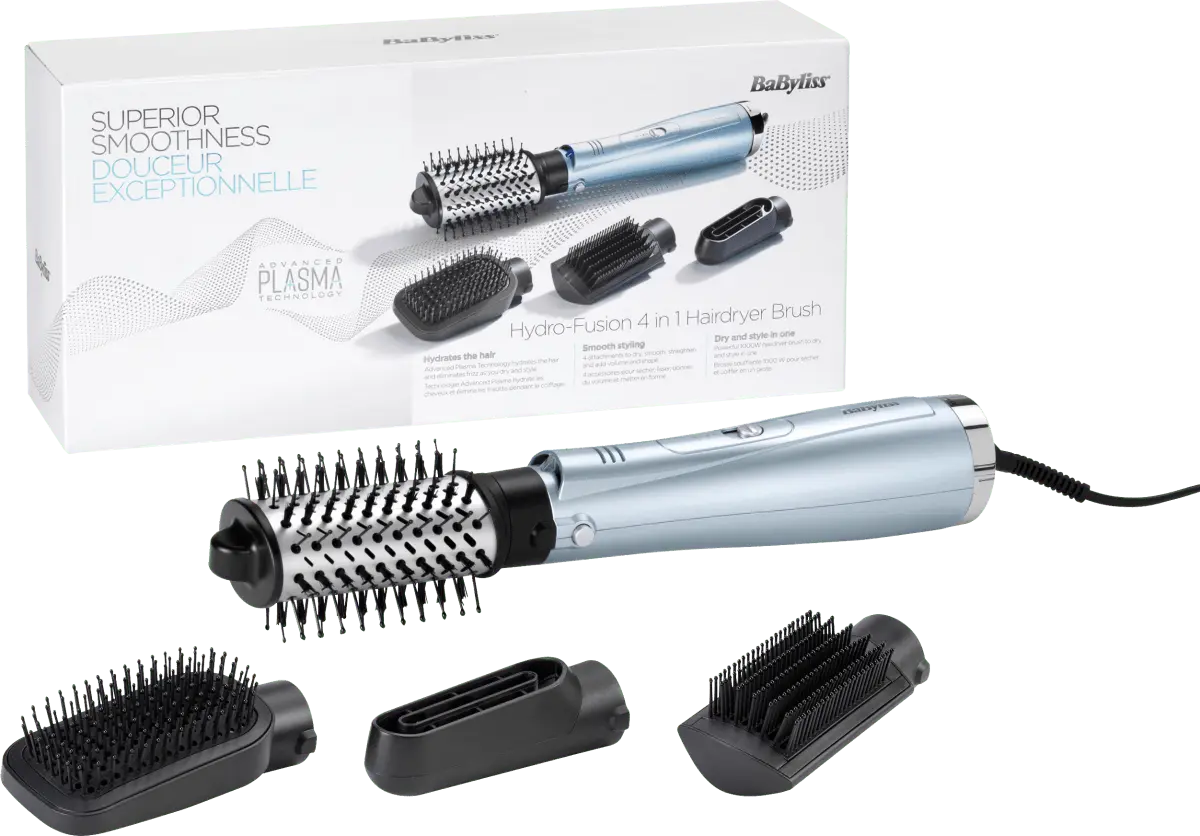 Использование BaByliss Hydro-Fusion 4- в 1: Гладкость и форма Щетка с горячим воздухом может использоваться как для укладки, так и для сушки волос. 4 сменные насадки сушат, разглаживают, расчесывают и придают форму волосам, создавая неповторимый и ухоженный вид. Благодаря ионной системе волосы также снабжаются влагой, а значит, остаются эластичными и блестящими даже после укладки.