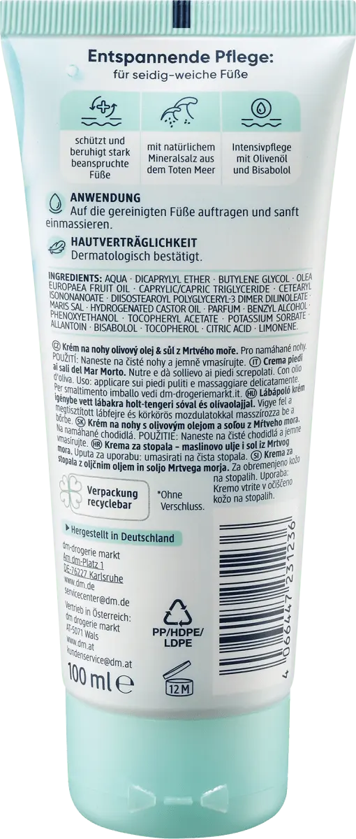 Крем для ног Мертвого моря от Balea расслабляет и нежно питает ноги и приятен. Особенно сухая, особенно подверженная стрессам кожа становится эластичной и мягкой с помощью содержащегося в ней оливкового масла и бисаболола. Рецепт без микропластика и водорастворимых чисто синтетических полимеров.