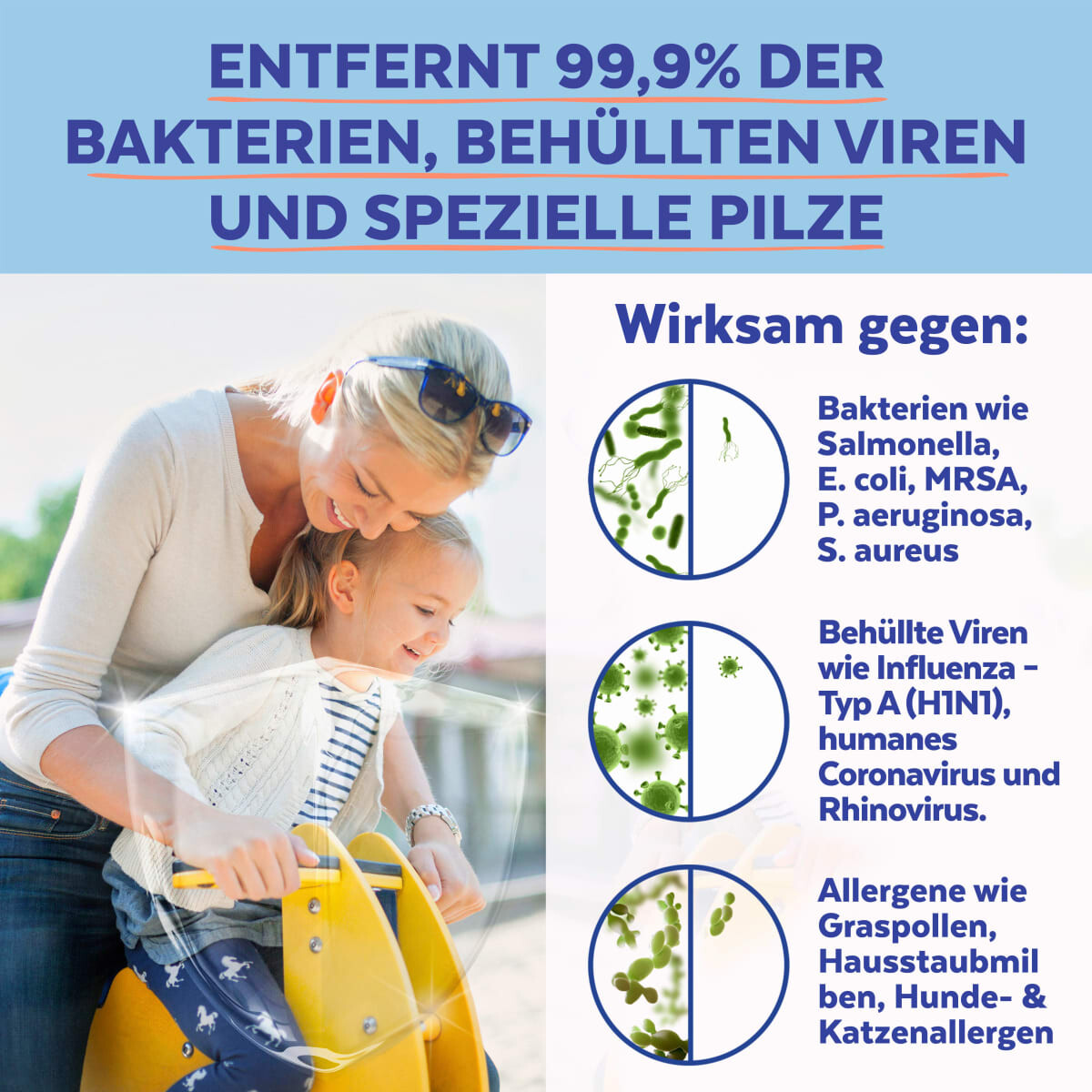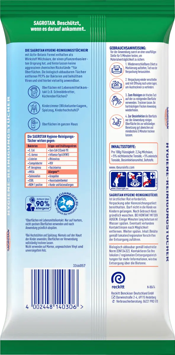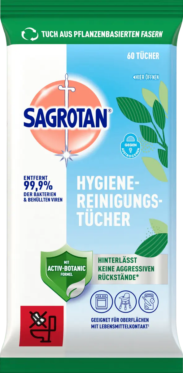 Гигиенические чистящие салфетки Sagrotan идеально подходят для бережной и эффективной чистки. Удаляется 99,9% бактерий, включая MRSA, Klebsiella pneumoniae NDM-1, кишечную палочку (ESBL) и более 90%* аллергенов. Формула салфеток не содержит отбеливателей и красителей, не имеет запаха. Это делает ткань идеальной для зон приготовления пищи и таких мест, как пеленальные коврики или детские обеденные стулья. Они рекомендованы немецкой организацией Skin and Allergy Aid для снижения количества аллергенов. Закрывающаяся упаковка предотвращает высыхание. После использования гигиенические чистящие салфетки можно выбросить вместе с бытовыми отходами. Они изготовлены из ткани с волокнами растительного происхождения и биоразлагаемы**. *Пыльца трав, фекалии пылевых клещей, аллергены собак и кошек. **Биоразлагаемый: тканевый материал, изготовленный из биоразлагаемых волокон растительного происхождения. Свяжитесь с местными или региональными предприятиями по утилизации отходов для получения дополнительной информации, например, об утилизации через контейнер для органических отходов.