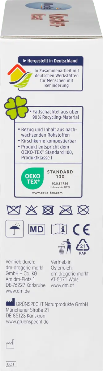 Инструкции по уходу: Подушки из вишневой косточки нельзя стирать, чтобы предотвратить образование гнили/плесени. Храните продукт в сухом месте! Берегите от влаги! Срок годности/Утилизация: Продукт следует заменить через 4 года при нормальном использовании. Подушку можно выбросить вместе с бытовыми отходами.