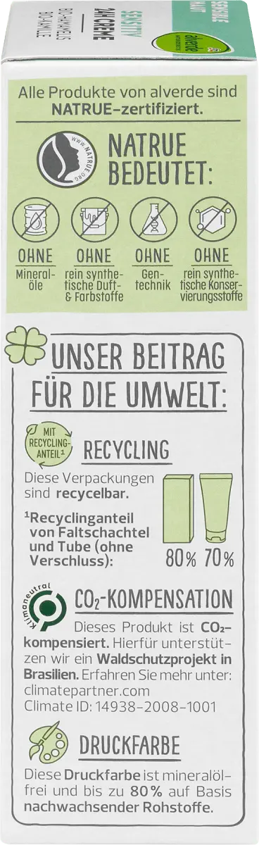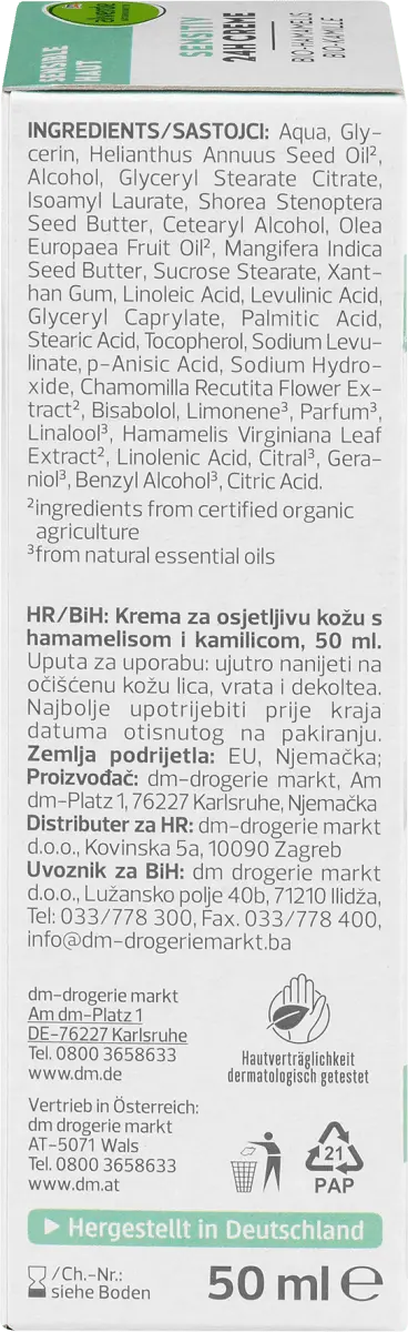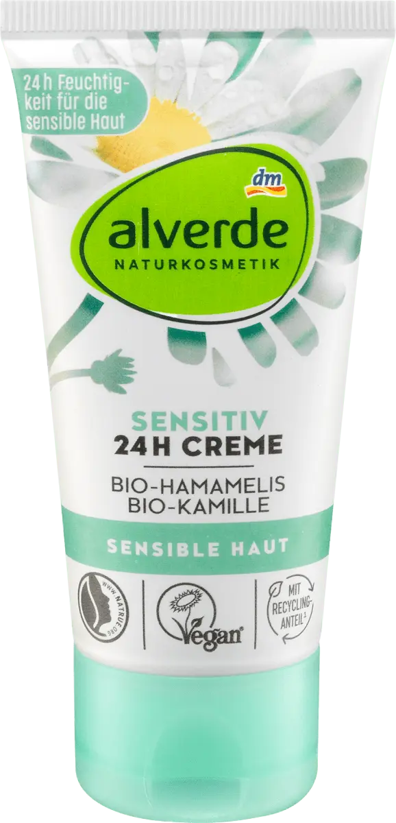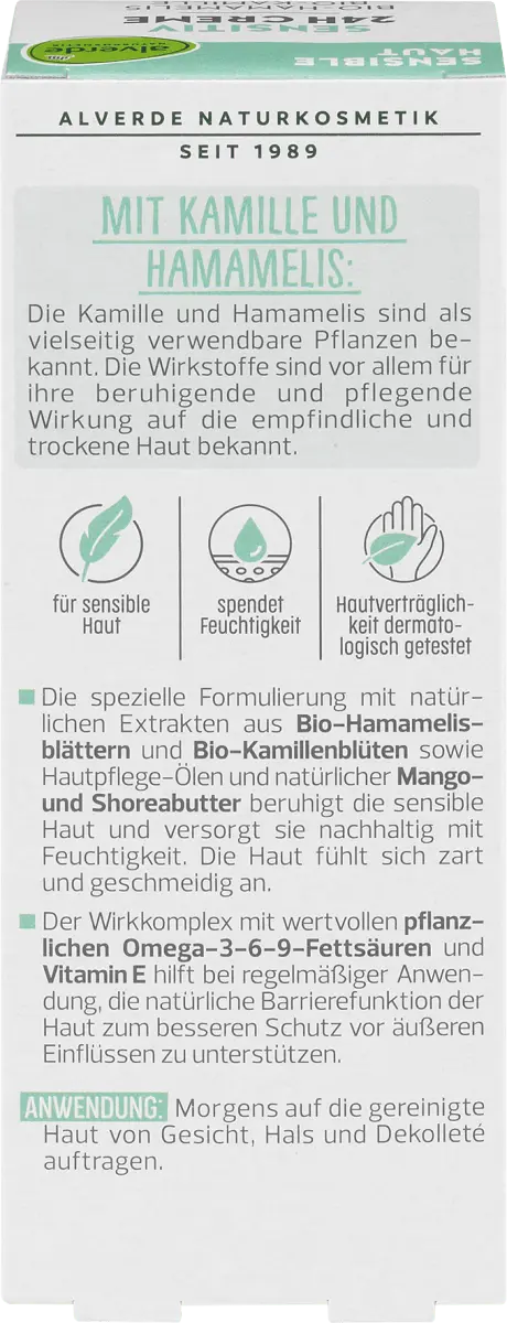 Откройте для себя крем для чувствительной кожи от alverde Натуральная косметика с ромашкой и гамамелисом, которые известны как универсальные растения. Активные ингредиенты наиболее известны своим успокаивающим и питательным действием на чувствительную и сухую кожу. Специальная формула с натуральными экстрактами органических листьев гамамелиса и органических цветков ромашки, а также маслами для ухода за кожей и натуральными маслами манго и шореа успокаивает чувствительную кожу и обеспечивает ей длительное увлажнение. После этого кожа становится мягкой и эластичной. При регулярном использовании активный комплекс с ценными жирными кислотами омега-3-6-9 растительного происхождения и витамином Е помогает поддерживать естественную барьерную функцию кожи для лучшей защиты от внешних воздействий. Рецепт без микропластика и водорастворимых, чисто синтетических полимеров.