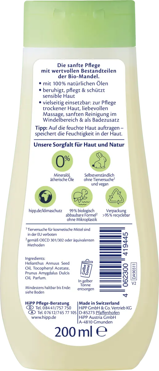 Масло для ухода от HiPP Babysanft питает, успокаивает и защищает чувствительную кожу с первого дня жизни особенно мягким способом с помощью органического миндального масла и других натуральных масел. Его также можно использовать по-разному: для ухода за сухой кожей, для нежного массажа, для нежного очищения области подгузника и в качестве добавки для ванн. Совет: Если нанести на влажную кожу, влага будет сохраняться в коже.