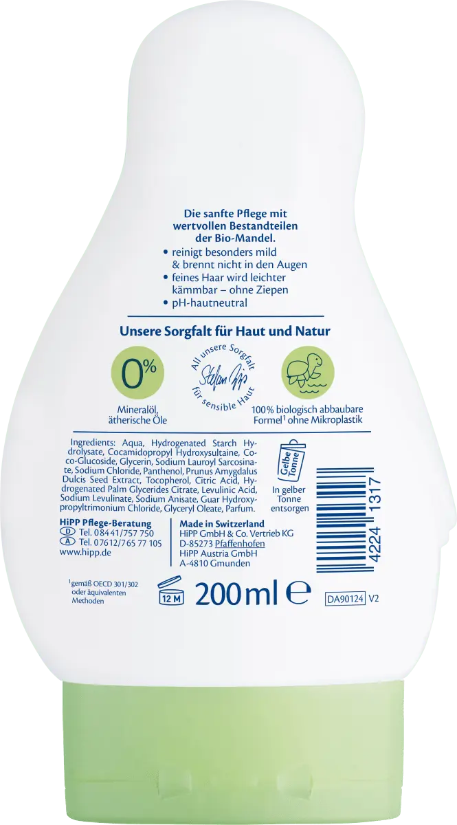 Мягкий гель для душа 2-в-1 с шампунем для чувствительной кожи от HiPP Babysanft бережно очищает чувствительную детскую кожу и тонкие волосы. Он имеет нейтральный pH для кожи и, конечно же, не щиплет глаза. Тонкие волосы также становятся легче расчесываться и не нужно их выдергивать.