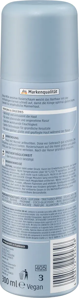 Пена для бритья Balea MEN чувствительная благодаря богатой формуле быстро смягчает волосы бороды, обеспечивая оптимальное скольжение лезвия. Особенно подходит для чувствительной мужской кожи, успокаивает и расслабляет кожу – для нежного и приятного бритья. Он обеспечивает успокаивающее увлажнение, а бережная технология обеспечивает превосходные результаты и заметно гладкую и напитанную кожу во время бритья. Состав без микропластика и водорастворимых синтетических полимеров.