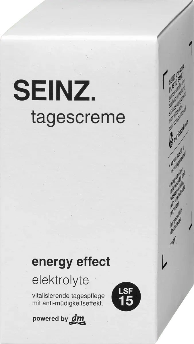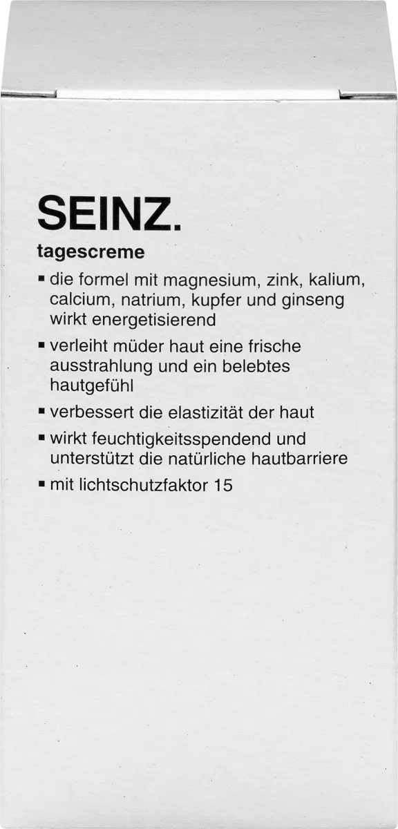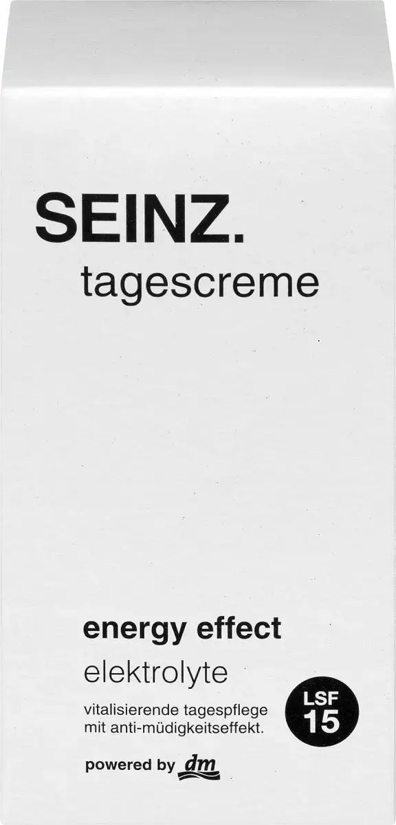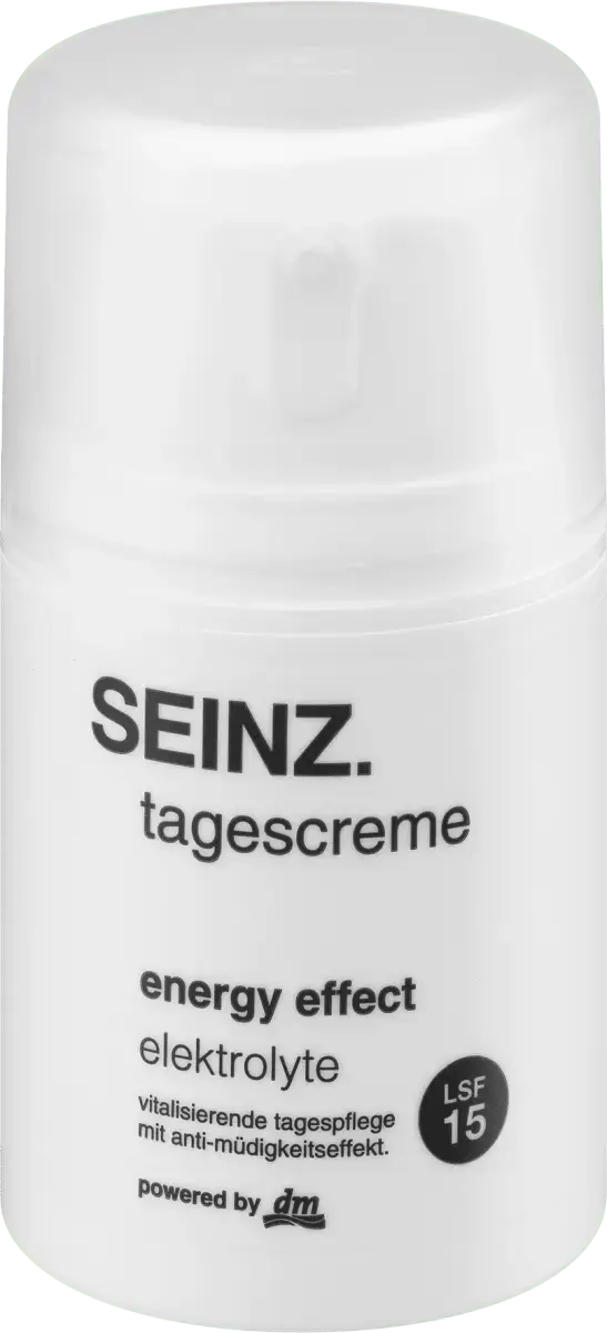 Формула SEINZ. Дневной крем «Энергетический эффект» с магнием, цинком, калием, кальцием, натрием, медью и женьшенем оказывает тонизирующее действие, придает уставшей коже свежее сияние и ощущение бодрости. Он также повышает эластичность кожи, оказывает увлажняющее действие и поддерживает естественный кожный барьер с фактором защиты от солнца 15.