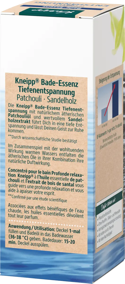 Эссенция для ванны Кнайпа глубокая релаксация позволяет телу и разуму успокоиться. Это обеспечивается натуральным эфирным маслом пачули и ценным экстрактом сандала.