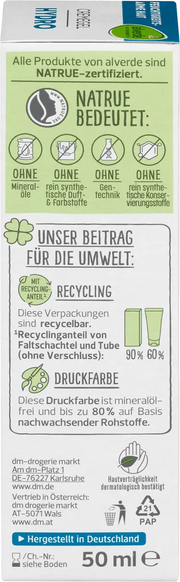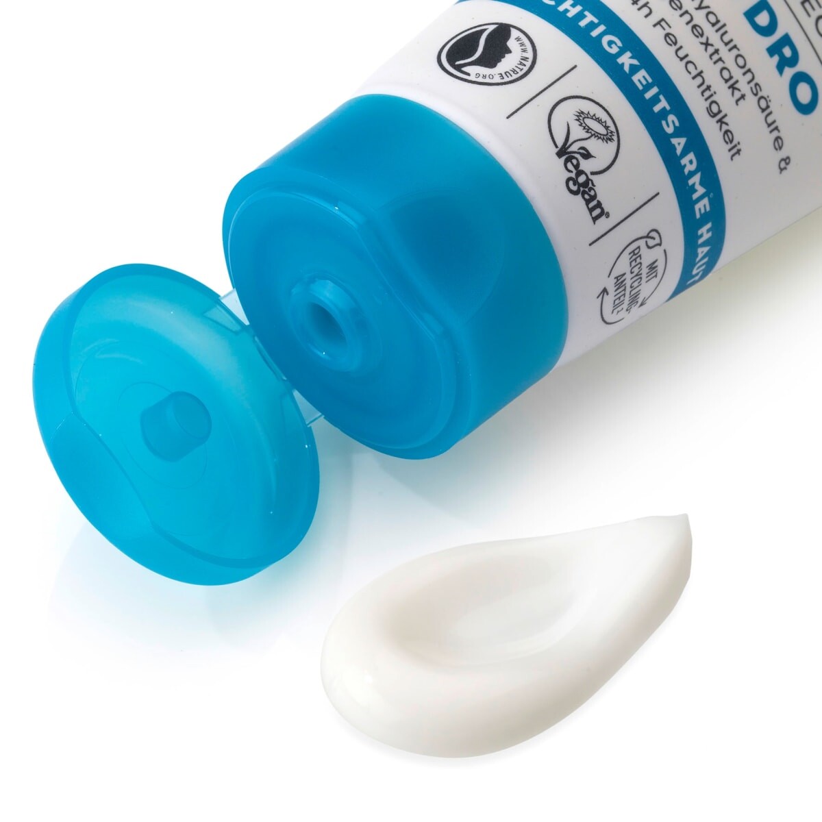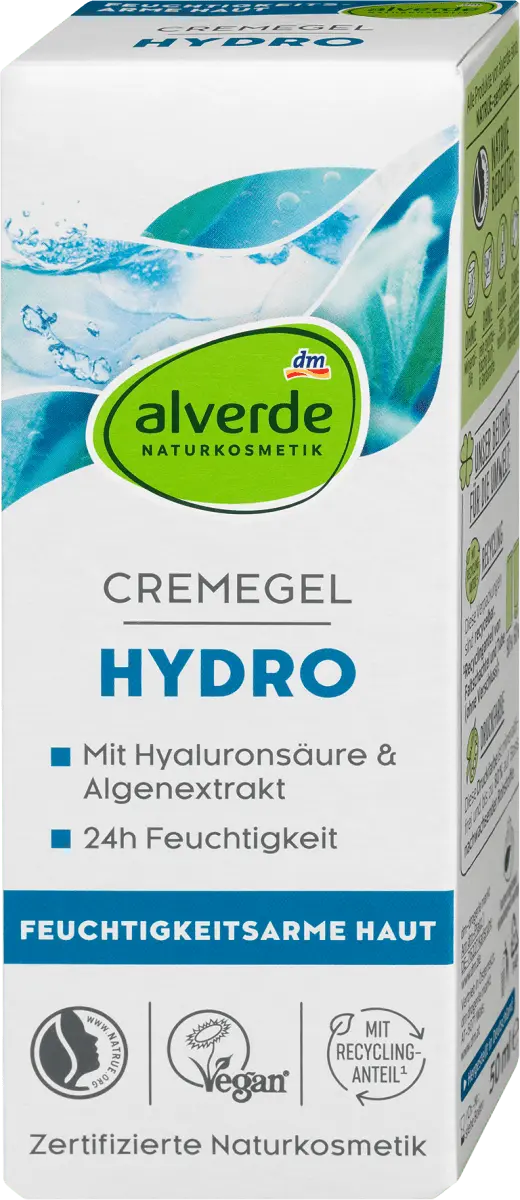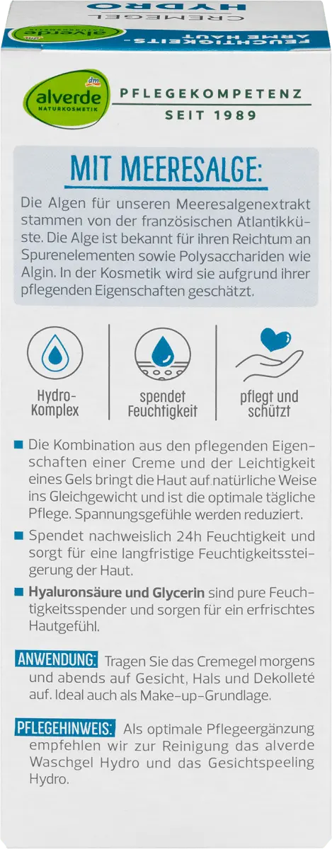 Гидрокрем-гель от Alverde NATURKOSMETIK создан с учетом потребностей обезвоженной кожи. В состав дневного крема входят гиалуроновая кислота и экстракт морских водорослей. Водоросли для экстракта морских водорослей происходят с французского атлантического побережья. Водоросли известны своим богатством микроэлементов и полисахаридов, таких как альгин. В косметике его ценят за питательные свойства. Сочетание питательных свойств крема и легкости геля естественным образом балансирует кожу и является оптимальным ежедневным уходом. Кроме того, доказано, что легкий гель-крем обеспечивает увлажнение на срок до 24 часов и обеспечивает долгосрочное повышение уровня влажности кожи. Чувство напряжения также можно уменьшить. Кроме того, гиалуроновая кислота и глицерин оказывают чистые увлажняющие свойства и придают коже ощущение свежести. Рецепт без микропластика и водорастворимых, чисто синтетических полимеров.