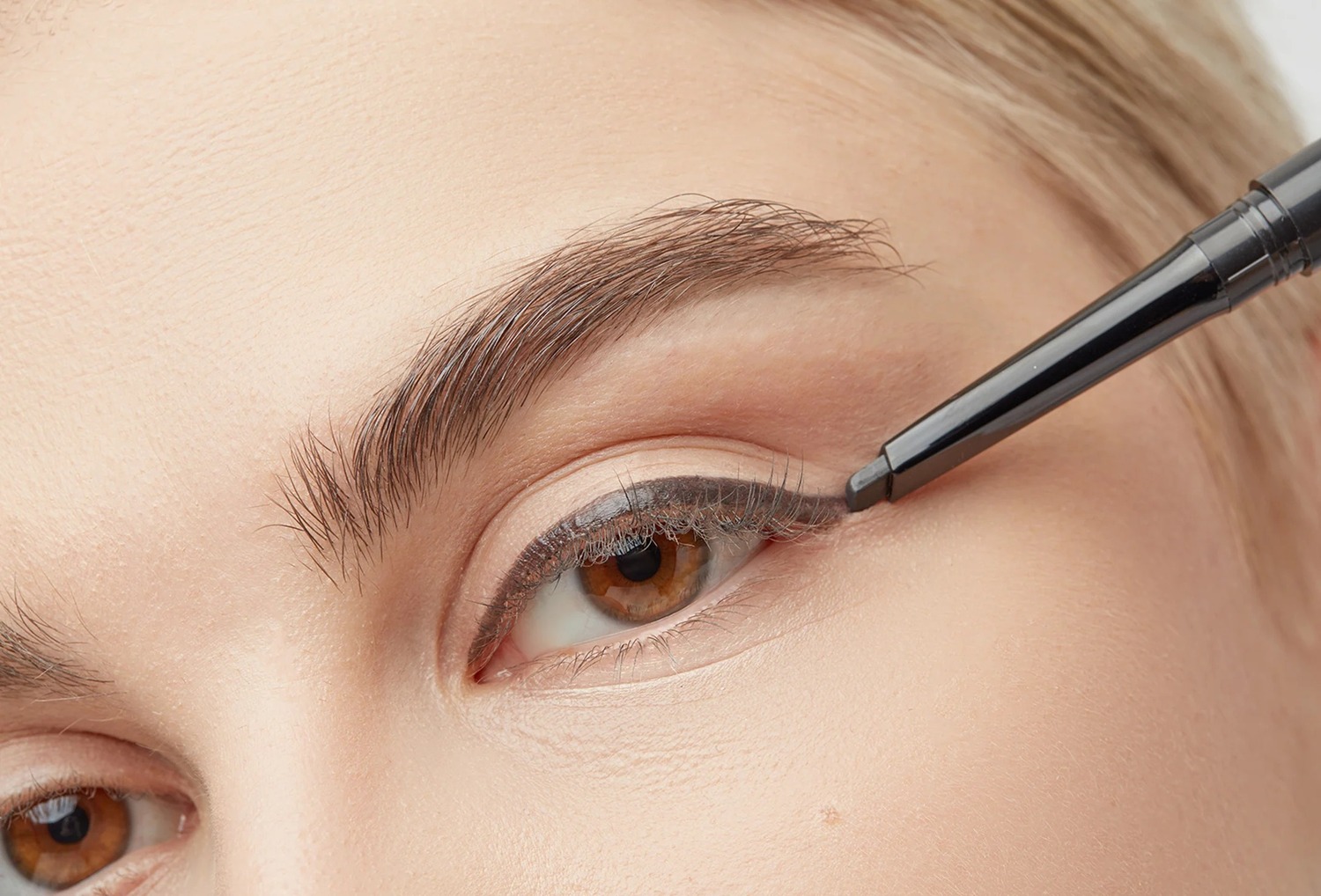 Нарисуйте стрелку и вытяните ее по направлению к виску. Растушуй стрелку щеточкой на обратной стороне лайнера в дымку, делая взгляд более подтянутым и дерзким.
