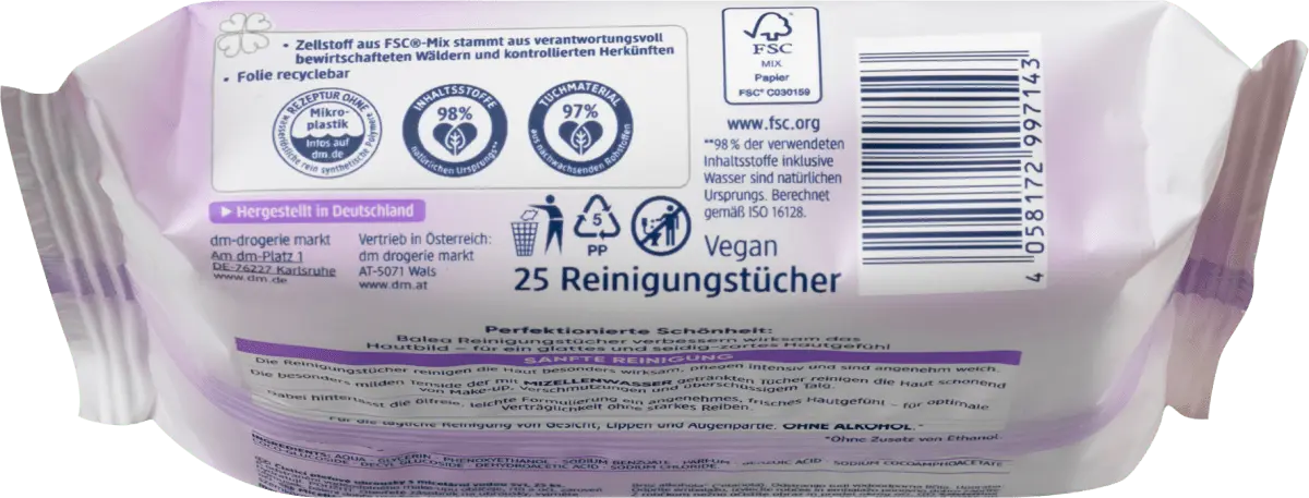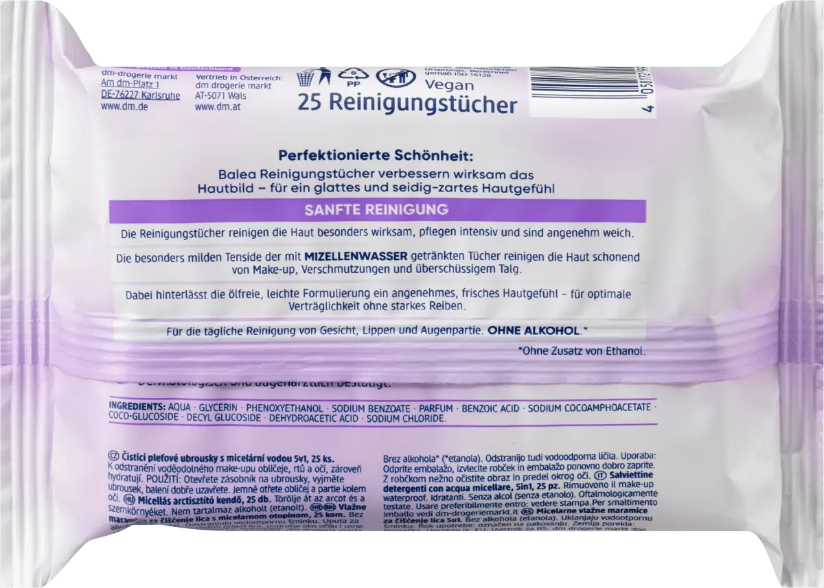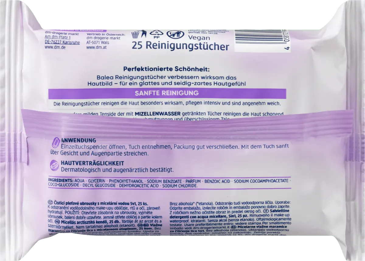 Мицеллярные очищающие салфетки Balea 5в1 особенно эффективно очищают кожу и имеют приятную мягкость. Особо мягкие поверхностно-активные вещества салфеток, пропитанных мицеллярной водой, эффективно и бережно очищают кожу от макияжа, загрязнений и излишков кожного сала. Нежирная, легкая формула оставляет на коже ощущение свежести и приятности без резкого натирания, что обеспечивает оптимальную переносимость. Для ежедневного очищения лица, губ и области вокруг глаз. Совместимость с кожей подтверждена дерматологически и офтальмологически. Без спирта* *Без этанола Рецептура без микропластика и водорастворимых чисто синтетических полимеров.