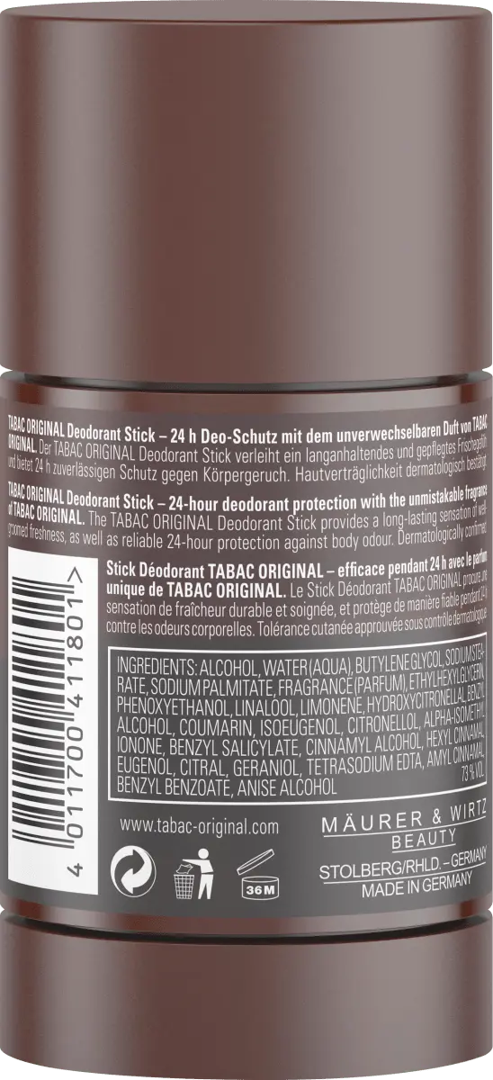 Яркая, терпко-пряная парфюмерная композиция для длительного и ухоженного ощущения свежести: Tabac Original Deostick своим неповторимым ароматом подчеркивает личную харизму тонкого мужского ухода.