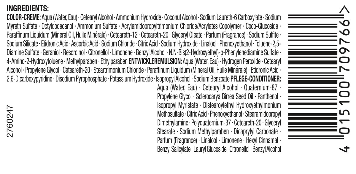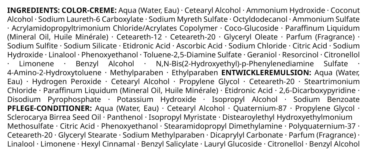Кондиционер, смыть: Аква (вода, вода)*Цетеариловый спирт*Кватерниум-87*Пропиленгликоль*Масло семян склерокарии бирреи*Пантенол*Изопропилмиристат* Дистеароилэтилгидроксиэтилмоний. Метосульфат*Лимонная кислота*Феноксиэтанол*Стеарамидопропилдиметиламин*Поликватерниум-37*Цетеарет-20*Глицерилстеарат*Метилпарабен натрия*Дикаприлилкарбонат*Парфюм (аромат)*Линалоол*Лимонен*Гексилциннамал*Бензилсалицилат*Лаурилглюкозид*Цитронеллол *Бензиловый спирт| Окрашивание/оттенок для волос, окислительное: Аква (вода, вода) * Цетеариловый спирт * Гидроксид аммония * Кокосовый спирт * Лаурет-6-карбоксилат натрия * Миретсульфат натрия * Октилдодеканол * Сульфат аммония * Хлорид акриламидопропилтримония / сополимер акрилатов * Коко-глюкозид * Жидкий парафин (Минеральное масло, Huile Minérale)*Цетеарет-12*Цетеарет-20*Глицеарилолеат*Парфюм (аромат)*Сульфит натрия*Силикат натрия*Этидроновая кислота*Аскорбиновая кислота*Хлорид натрия*Лимонная кислота*Гидроксид натрия*Линалоол*Феноксиэтанол *Толуол -2,5-Диаминсульфат*Гераниол*Резорцин*Цитронеллол*Лимонен*Бензиловый спирт*N,N-бис(2-гидроксиэтил)-п-фенилендиаминсульфат*4-Амино-2-гидрокситолуол*Метилпарабен*Этилпарабен|Проявитель: Аква (Вода, Eau)*Перекись водорода*Цетеариловый спирт*Пропиленгликоль*Цетеарет-20*Хлорид стеартримония*Жидкий парафин (минеральное масло, минеральное масло)*Этидроновая кислота*2,6-дикарбоксипиридин*Диатрийпирофосфат*Гидроксид калия*Изопропиловый спирт* Бензоат натрия