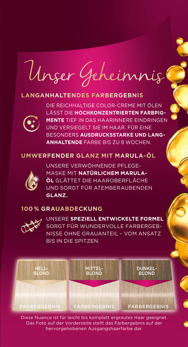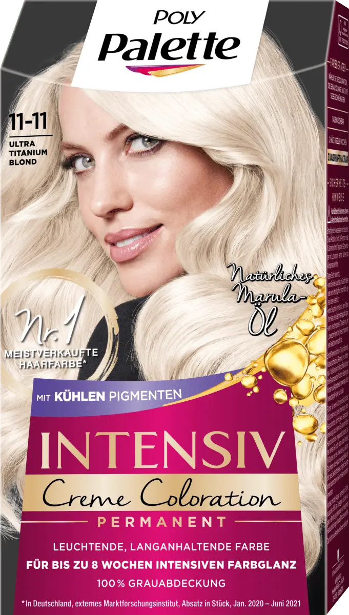 Богатая полипалитра Intensiv Крем-краска Ultra Titanium Blond 11–11 позволяет высококонцентрированным цветным пигментам проникать глубоко в структуру волос и закреплять их в волосах. Для особенно выразительного и стойкого цвета до 8 недель. Ухаживающая маска с натуральным маслом марулы разглаживает поверхность волос и придает им потрясающий блеск. Вы также получаете 100% покрытие серого цвета. Этот оттенок рекомендуется для светло-русых и темно-русых волос и подходит для слегка или полностью седых волос.