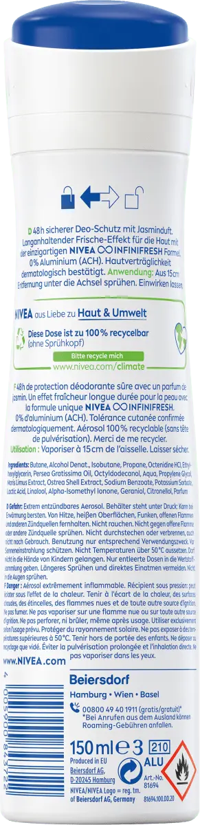 Дезодорант-спрей NIVEA Fresh Pure обеспечивает 48 часов надежной дезодорирующей защиты без алюминия (ACH). Освежающая формула позволяет коже свободно дышать и обещает оптимальное сочетание ухода NIVEA и эффективной защиты от запаха тела.