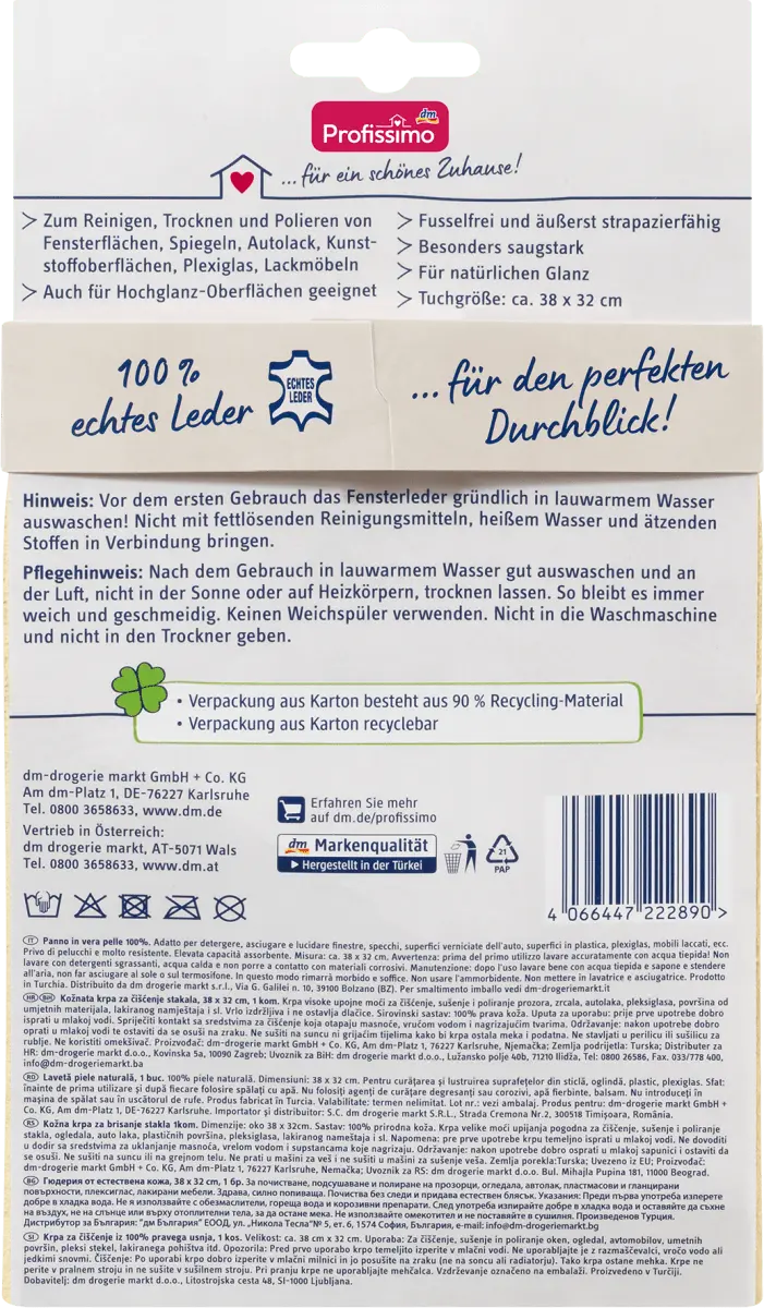Практическая натуральная замша из коллекции Profissimo обладает особенной впитывающей способностью и поэтому является чрезвычайно полезной тканью для чистки. . Вы можете использовать его в домашних условиях по-разному, поскольку он подходит не только для чистки, но также для сушки и полировки оконных поверхностей, зеркал, автомобильной краски, пластиковых поверхностей, оргстекла, лакированной мебели и многого другого. Также подходит для глянцевых поверхностей. Замша сертифицирована OEKO-TEX. *Упаковка содержит не менее 70% переработанного материала.