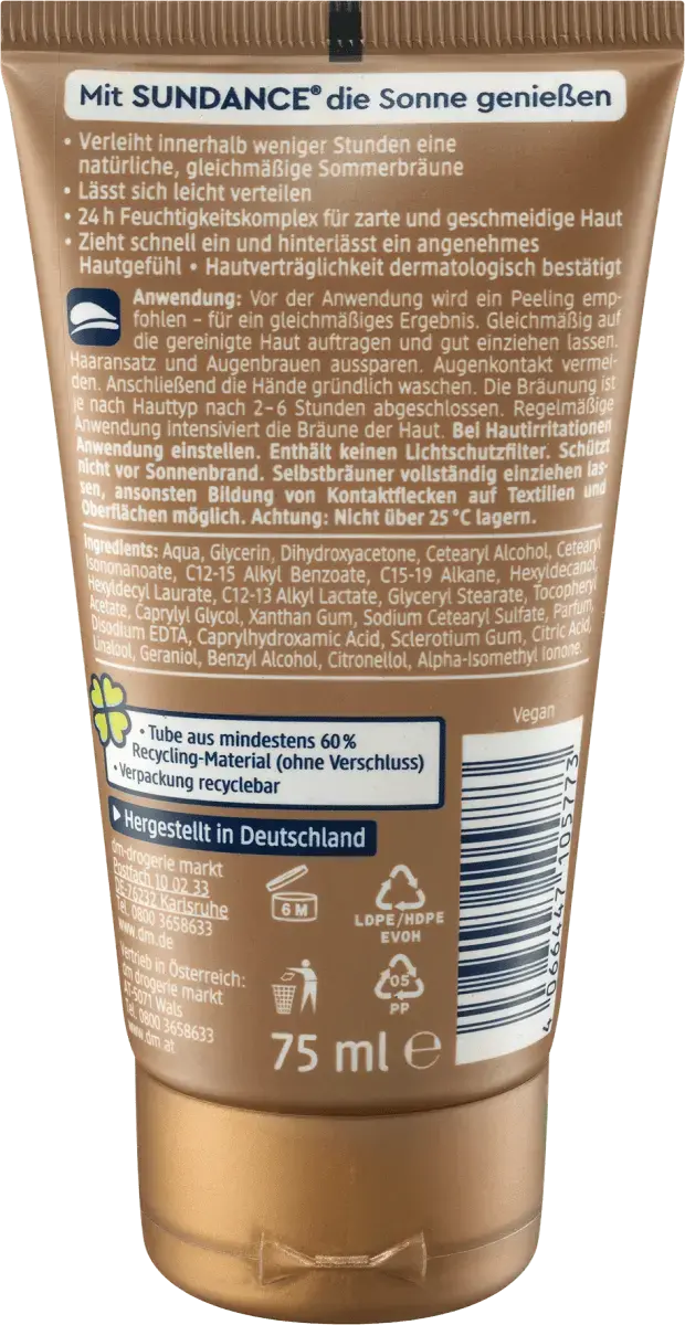 Веганский автозагар SUNDANCE Крем в течение нескольких часов дает естественный, ровный летний загар, который легко распределяется, быстро впитывается и оставляет на коже приятное ощущение. 24-часовой увлажняющий комплекс для мягкой и эластичной кожи. Совместимость с кожей одобрена дерматологами. Рецепт без микропластика и водорастворимых, чисто синтетических полимеров.