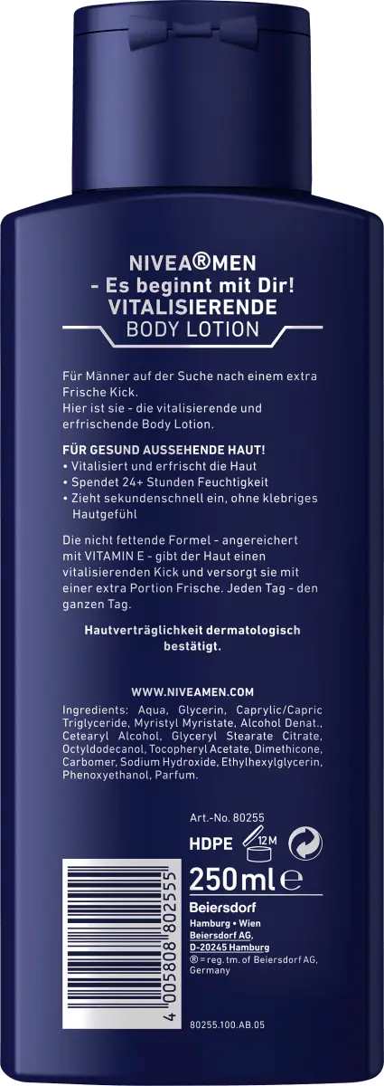 Nivea Men Vitalizing Body Lotion заботится о нормальной и сухой мужской коже. Питает, оздоравливает и быстро впитывается. Он также обеспечивает влажность - более 24 часов!