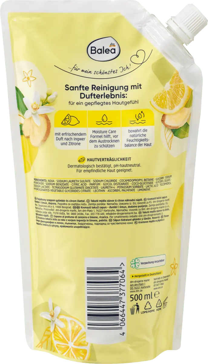 Запасной пакет крем-мыла Balea «Имбирь и лимон» с цитрусово-свежим ароматом сохраняет естественный водный баланс кожи. Формула Moisture Care защищает от высыхания. Рецептура без микропластика и водорастворимых, чисто синтетических полимеров.