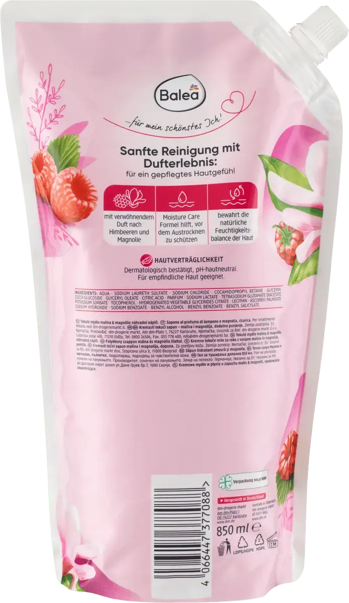 Запасной пакет крем-мыла Balea «Малина и магнолия» с фруктовым питательным ароматом сохраняет естественный водный баланс кожи. Формула Moisture Care защищает от высыхания. Рецептура без микропластика и водорастворимых, чисто синтетических полимеров.
