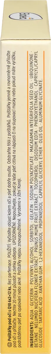 АКВА, ГЛИЦЕРИН, ПОЛИВИНИЛОВЫЙ СПИРТ, СОРБИТОЛ , ЖЕЛАТИН, ПОЛИАКРИЛАТ НАТРИЯ, МАСЛО СЕМЯН МАКАДАМИИ ЦЕНТРАЛЬНОЙ, УБИХИНОН, БЕТАИН, ЭКСТРАКТ ЦВЕТКОВ НЕЛЮМБО NUCIFERA, ЭКСТРАКТ Плодов чернослива, ТОКОФЕРОЛ, ДИНАТРИЙ ЭДТА, ФЕНОКСИЭТАНОЛ, КАПРИЛИЛ/КАПРИЛ, ГЛЮКОЗИД, ВИННАЯ КИСЛОТА, КСАНТ ХАН ГУМ, 1,2-ГЕКСАН ЭДИОЛ , ПРОПАНЕДИОЛ, КАПРИЛИЛОВЫЙ ЭФИР, ОЛУС МАСЛО, АЛЮМИНИЕВЫЙ ГЛИЦИНАТ
