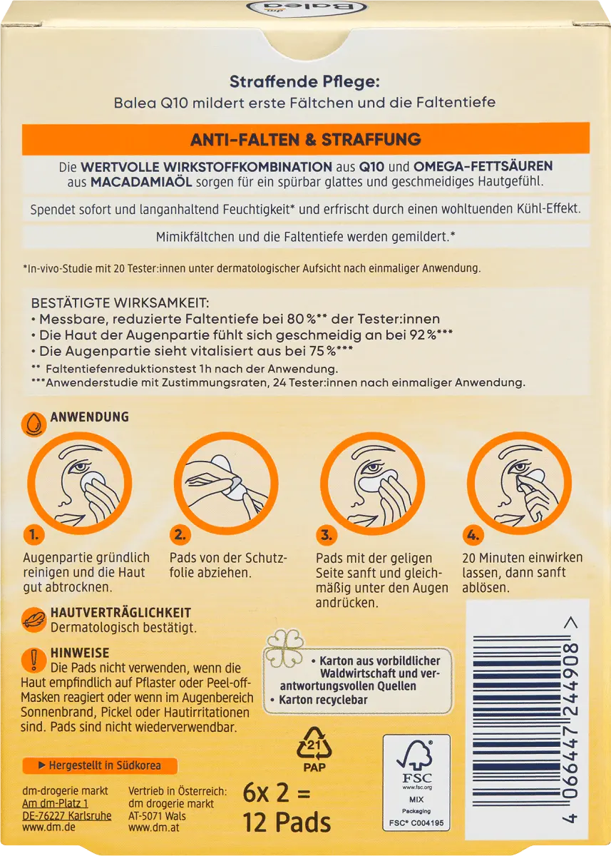 Укрепляющий уход : Balea Q10 смягчает первые и глубину морщин. ЦЕННАЯ АКТИВНАЯ КОМБИНАЦИЯ Q10 и ОМЕГА-ЖИРНЫХ КИСЛОТ из МАСЛА МАКАДАМИИ обеспечивает заметное ощущение гладкости и эластичности кожи. Обеспечивает мгновенное и длительное увлажнение* и освежает, оказывая успокаивающий охлаждающий эффект. Уменьшаются мимические морщины и глубина морщин.* *Исследование in-vivo с участием 20 тестеров под дерматологическим наблюдением после однократного применения.