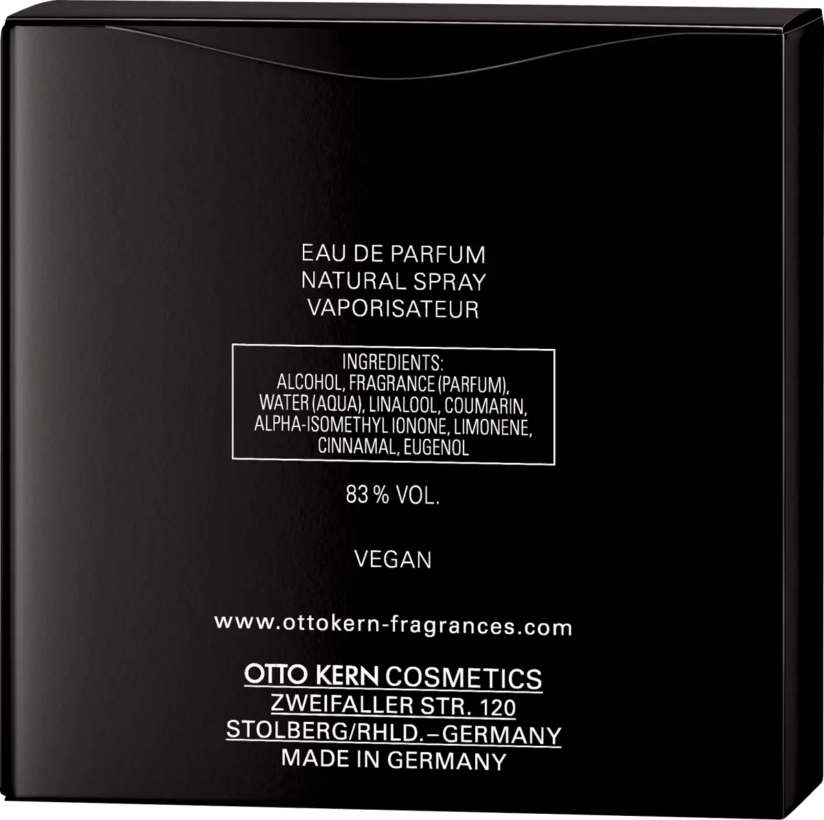 ИНГРЕДИЕНТЫ: АЛКОГОЛЬ, АРОМАТ (ДУХИ), ВОДА (АКВА), ЛИНАЛООЛ, КУМАРИН, АЛЬФА-ИЗОМЕТИЛ-ИОНОН, ЛИМОНЕН, CINNAMAL,EUGENOL