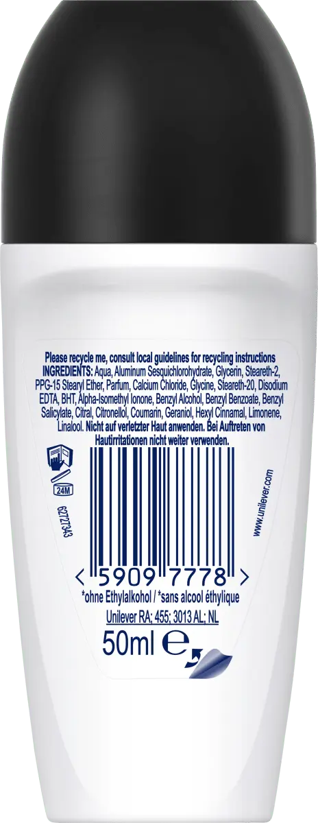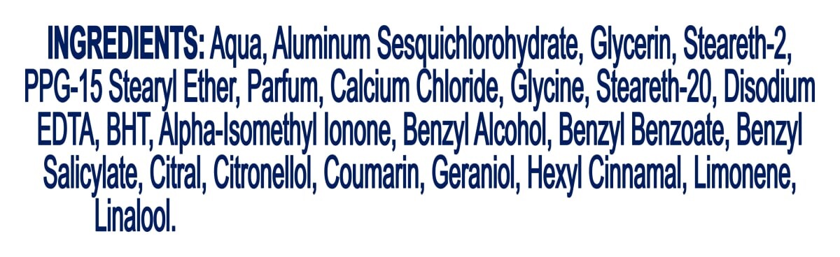 Состав : Вода, сесквихлоргидрат алюминия, глицерин, стеарет-2, стеариловый эфир PPG-15, отдушка, хлорид кальция, глицин, стеарет-20, динатрия ЭДТА, каприловый/каприновый триглицерид, BHT, альфа-изометилионон, бензиловый спирт, бензилбензоат. Бензилсалицилат, Цитраль, Цитронеллол, Кумарин, Гераниол, Гексилциннамал, Лимонен, Линалоол
