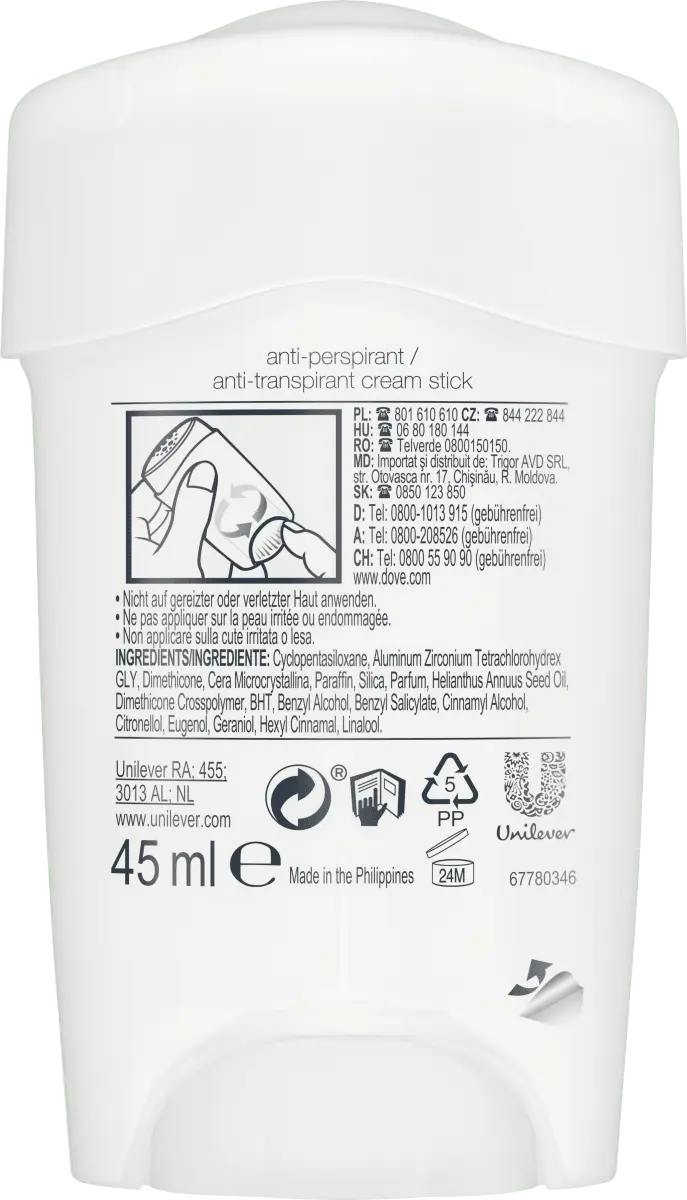 Для ощущения свежести и безопасности в течение всего дня: Выверните антиперспирант с помощью колесика-аппликатора, по одному щелчку на подмышку. Аккуратно вотрите дезодорант в подмышки. Вы можете использовать крем-антиперспирант Dove Maximum Protection утром, но: ночью наши потовые железы работают меньше, кожа становится суше, и формула может работать оптимально - для длительной защиты на следующий день.