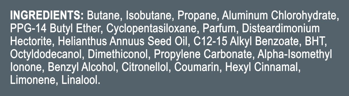 Состав: бутан, изобутан, пропан, хлоргидрат алюминия, бутиловый эфир PPG-14, циклопентасилоксан, отдушка, гекторит дистеардимония, масло семян Helianthus Annuus, алкилбензоат C12-15, BHT, октилдодеканол, диметиконол, пропиленкарбонат, альфа-изометилионон, бензиловый спирт, цитронеллол, кумарин, гексилциннамал, лимонен, линалоол.