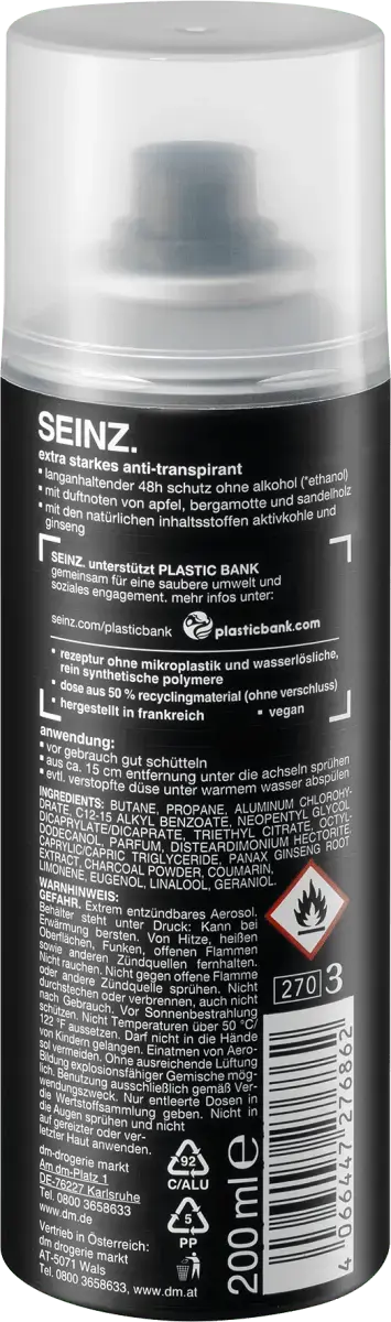 SEINZ. Сверхсильный антиперспирант обеспечивает 48-часовую длительную защиту благодаря активированному углю и отсутствию спирта (этанола). Он также впечатляет ароматами яблока, бергамота и сандалового дерева, а также натуральными ингредиентами, активированным углем и женьшенем. Банка на 75 % изготовлена ​​из переработанного материала (без крышки) в Германии. СЕЙНЦ. также поддерживает Plastic Bank – вместе за чистую окружающую среду и социальные обязательства. Дополнительную информацию можно найти на сайтах: seinz.com/ Plasticbank и Plasticbank.com.